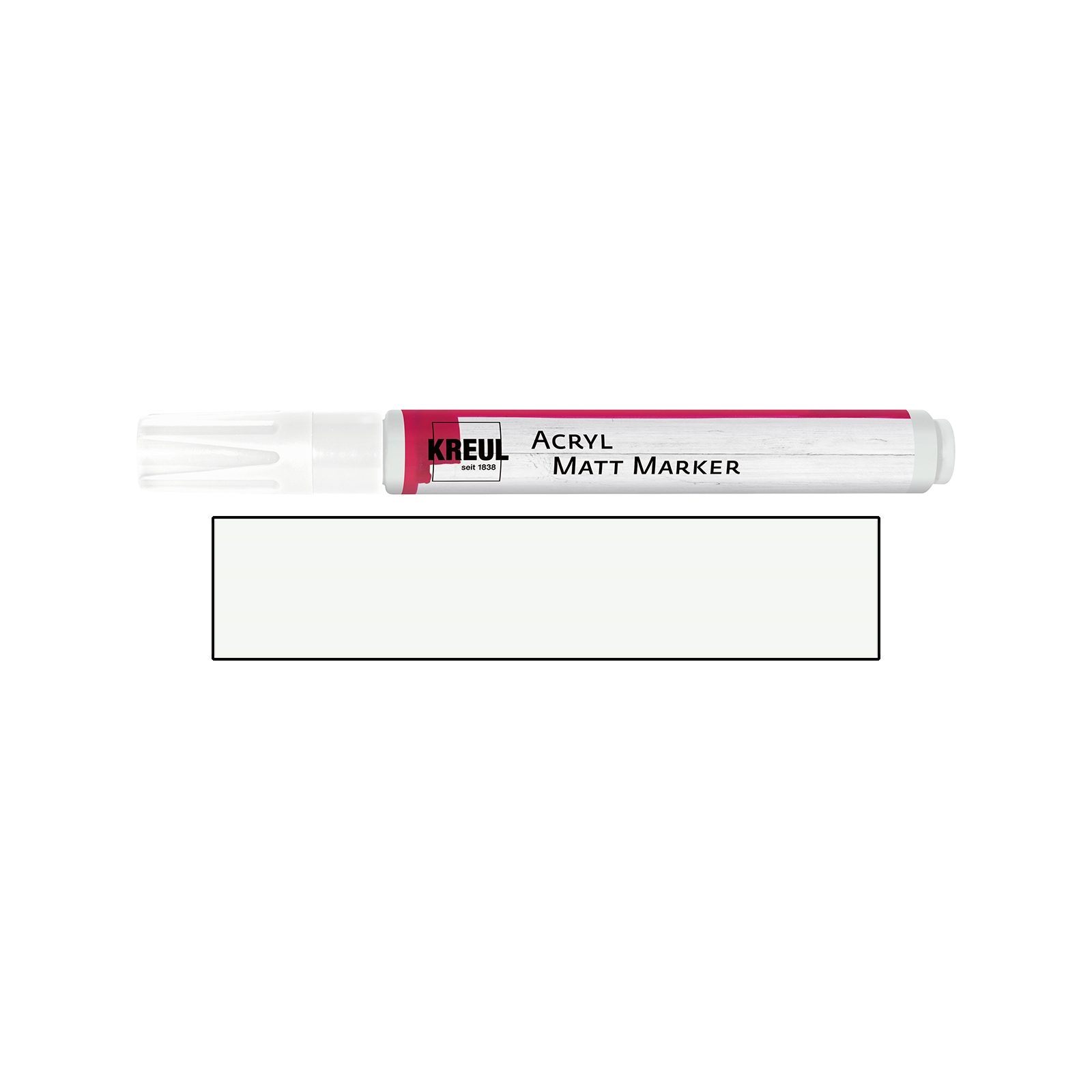Akrylový marker matný KREUL medium biely je nepriehľadný popisovač so stredne veľkým guľatým hrotom tvoriaci čiaru so šírkou cca 2 - 4 mm. Marker je vyplnený matnou akrylovou farbou vhodnou na drevo, kartón, papier, polystyrén, sklo, hlinu, kov, plast, gumu či betón. Možno ho použiť aj na papier. Podklad musí byť suchý a bez prachu. Farba často kryje už pri prvom ťahu. Pomocou markera môžete zdobiť predmety aj maľovať obrázky.
