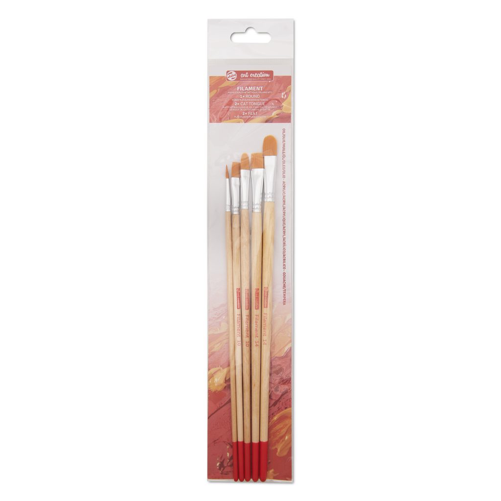 Sada univerzálnych štetcov z radu Art Creation sa hodí na rôzne maliarske techniky, ako je olejová, akrylová, akvarelová aj temperová maľba alebo gvaš. Syntetický vlas Filament tvorí polyesterové vlákno, ktoré sa hodí na väčšinu mokrých techník vrátane farieb s hustejšou konzistenciou. Vlákna dobre absorbujú aj väčšie množstvo farby. Štetce majú dlhú lakovanú rukoväť vo farbe svetlého dreva, ktorá sa príjemne drží a dobre sa s ňou pracuje. Na zachovanie čo najdlhšej životnosti štetca ho ihneď po použití vymyte teplou vodou s mydlom (v prípade maľby olejovými farbami použite najskôr riedidlo), a potom vytvarujte štetec do pôvodného tvaru. Štetce skladujte nastojato, vlasom nahor. Sada obsahuje dokopy 5 štetcov, konkrétne tieto druhy a veľkosti: okrúhly vo veľkosti 6, ktorý sa hodí na vytváranie detailov; ploché vo veľkostiach 10 a 14, ktoré sa hodia na vytváranie plôch a na rovnomerný ťah; mačací jazýček vo veľkostiach 10 a 14, ktoré sa hodia na vytváranie ako plôch, tak aj detailu. Dĺžka štetcov v sade je od 28 do 30 cm.