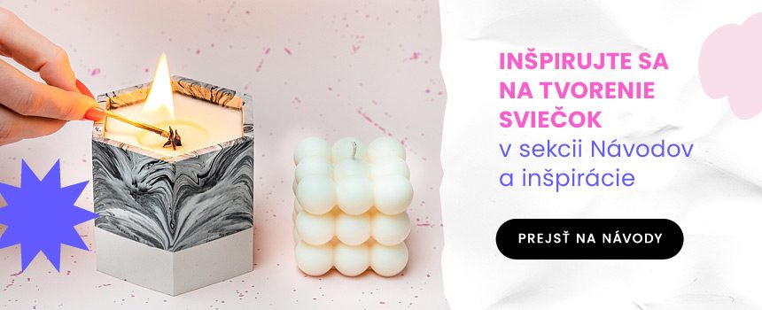 Zahorte pre tvorenie sviečok v sekcii Návodov a inšpirácie! Návody pravidelne pridávame a môžete si tak vyskúšať nielen tvorenie do silikónových foriem alebo nádob, ktoré si môžete kúpiť, ale tiež napríklad do starých zavarovačiek, ktoré tak môžete jednoducho upcyklovať a zažať v nich nový plamienok. Návody sú zdarma, naopak nás veľmi poteší, ak výsledky svojej tvorby inšpirované práve v tejto sekcii Návodov označíte na sociálnych sieťach, aby sme sa spolu s vami mohli radovať z hotového diela!