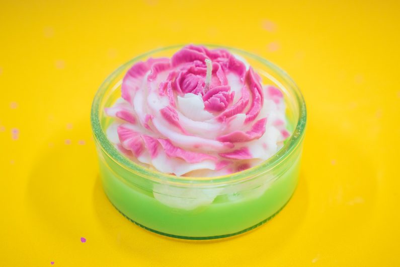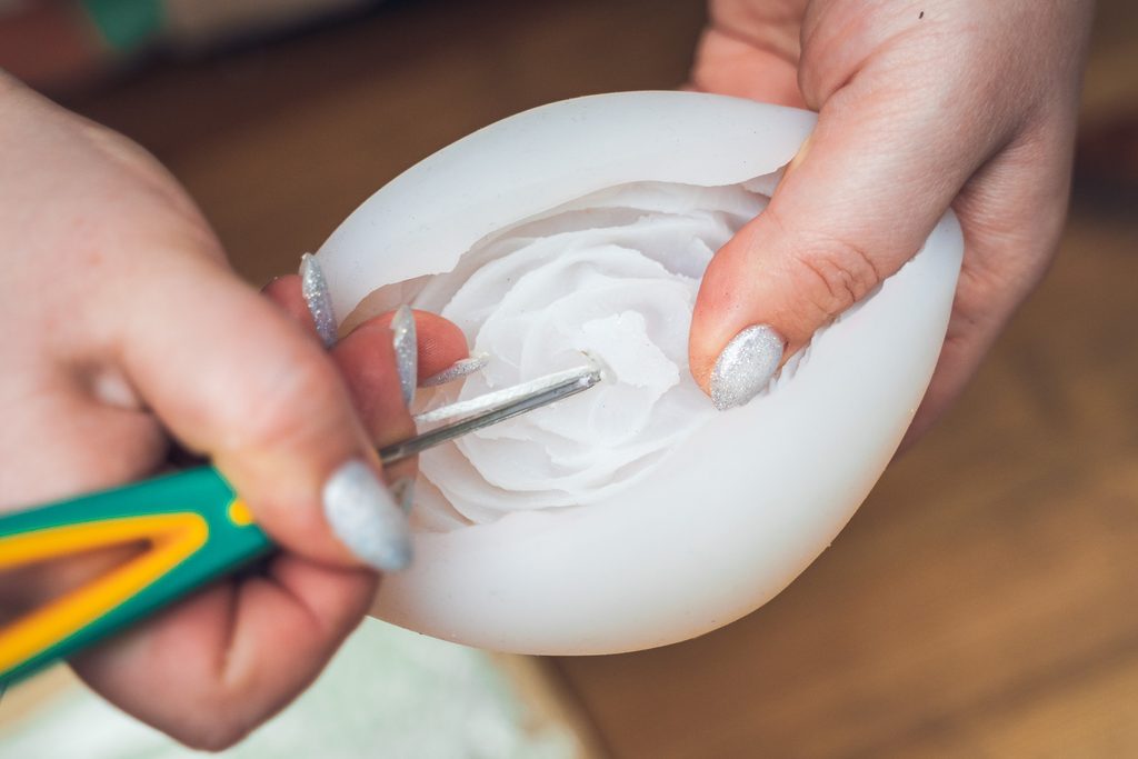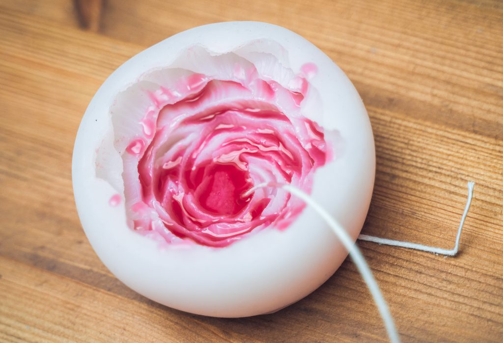 Nejdříve nalijeme do formy/růžový červený vosk, především po okrajích, abychom dosáhli zabarvení špiček okvětních lístků. Tento zabarvený vosk je třeba nechat alespoň trochu zatvrdnout a poté dolijeme zbytkem neobarveného vosku.