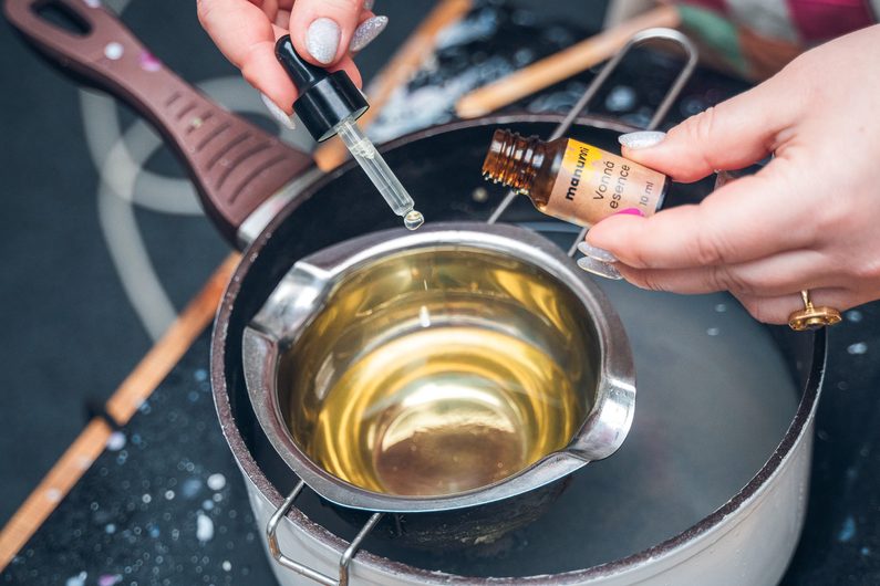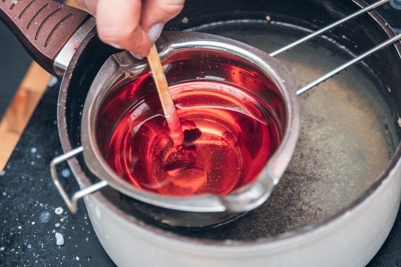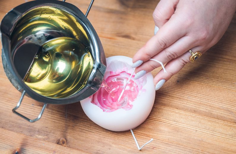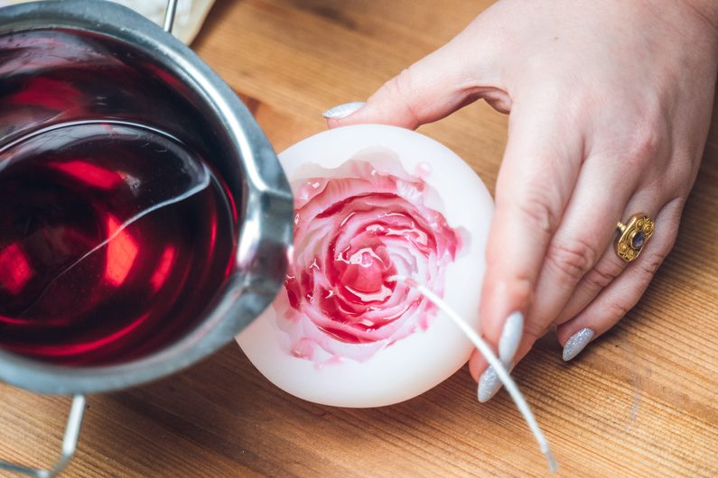 Vše ve středu jemně promíchejte (abychom se zbavili bublinek) a naplňte formu z 95% a nechte částečně vytvrdnout. Poté dolejte formu zbývajícím voskem do plna a nechte vychladnout. Svíčku z formy vytahujeme až úplně ztuhlou, lehce odloupneme okraje, aby se do formy dostal vzduch a poté vytlačujeme. Pokud nám to jde ztěžka, můžeme si pomoci lehkým popotažením za konec knotu. Svíčku lze také před vytažením z formy krátce vložit do ledničky.