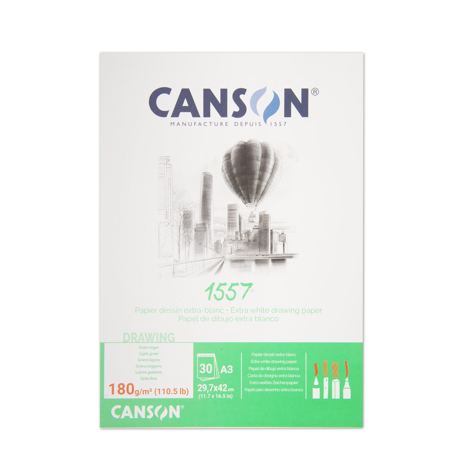 Skicár Canson 1557 je vynikajúcou voľbou pre umelcov aj začiatočníkov, ktorí hľadajú kvalitný papier na svoje kresby, skice a ďalšie výtvarné práce. Ide o tvrdý papier formátu A3 s gramážou 180 g/m², ktorý sa vyznačuje aj svojou belosťou. V lepenom bloku nájdete 30 listov. Papier je vyrobený z výnimočnej celulózy alfa (najčistejšia forma celulózy bez drevitých vlákien), lepený v hmote aj povrchovo, a preto ideálne znáša mnohonásobné vymazávanie a korekcie. Skvele sa naň kreslí pastelkami, ceruzkami, tuhami, pastelmi, fixkami či akvarelovými farbami a hodí sa aj na skladanie, lepenie či rezanie.