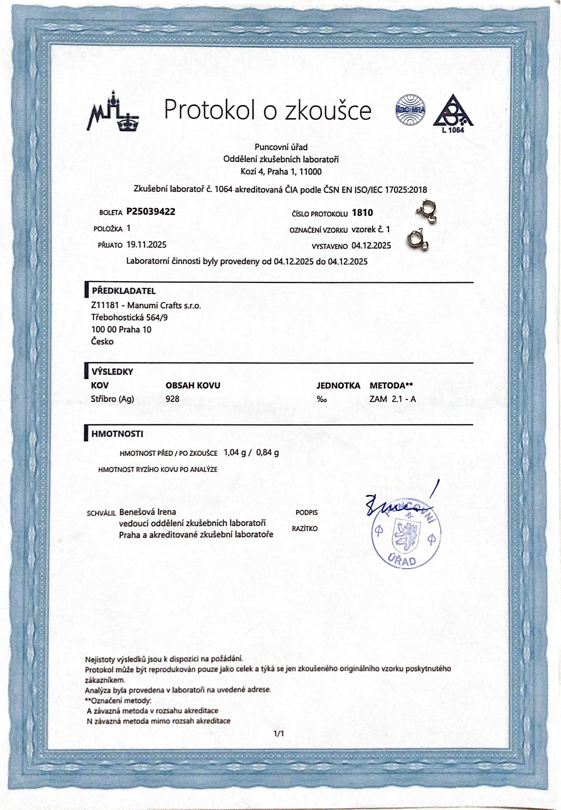 Nielen, že sme ako Manumi registrovaným predajcom strieborných komponentov (o čom si môžete prečítať viac nižšie), máme k dispozícii protokoly o skúške 10 náhodných komponentov zo striebra Ag 925/1000 od Puncového úradu. Prezrite si ich tu: