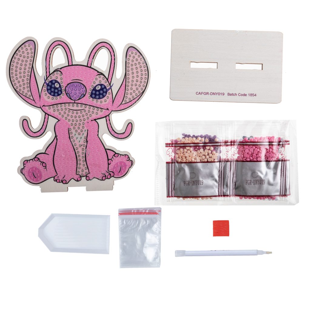 Vytvořte si Angel z pohádky z pohádky Lilo & Stitch technikou diamantového malování, tedy lepením barevných kamínků na předpřipravený vzor. Na samolepicí dřevěné destičce ve tvaru postavičky jsou vyznačené jednotlivé barvy, které je třeba použít. Stačí si jen vybrat vzor, vzít do ruky aplikátor a začít tvořit. Když bude dílo hotové, nezapomeňte kamínky rovnoměrně přitlačit na destičku (třeba knihou nebo prkénkem), abyste se ujistili, že jsou všude stejně kvalitně přilepené. Aplikování kamínků je velmi snadné. Do hrotu aplikátoru si můžete nabrat trochu vosku z voskového čtverečku a diamanty pak budou v aplikátoru hezky držet. Hotový výrobek můžete postavit do přiloženého dřevěného podstavce a dílko si takto vystavit.