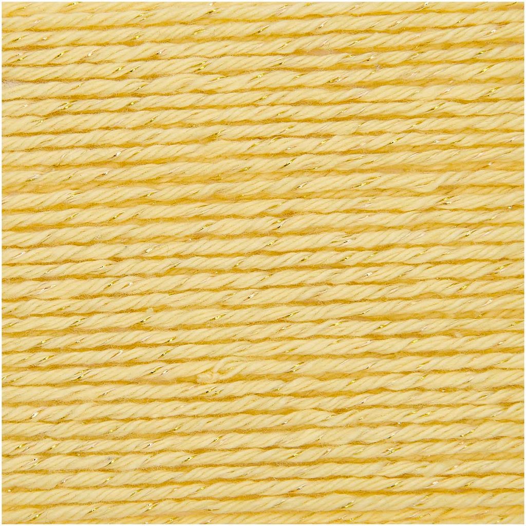 Háčkovací příze Ricorumi Twinkly Twinkly ve žluté barvě (005) s třpytivými vlákny ve zlatých odstínech je oblíbená na háčkování různých hraček, postaviček a zvířátek ve stylu amigurumi případně i pro tvorbu doplňků. Klubíčko 25 g má návin 57,5 m. Příze obsahuje 99 % bavlny a 1 % polyesteru. Pro háčkování doporučujeme použít háček velikosti 3 - 4 mm. Tato kvalitní příze má jemnou strukturu, která je příjemná na omak a originální třpytivé odlesky. Objevte kouzlo Ricorumi přízí a pusťte se do nových háčkovacích projektů.