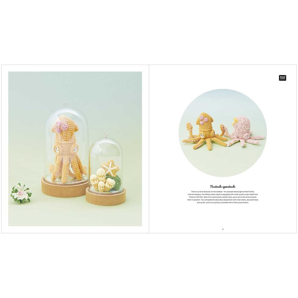 Kniha návodov na háčkovanie Ricorumi – Svet pod vodou v anglickom jazyku obsahuje 13 návodov na výrobu háčkovaných postavičiek a zvieratiek s motívmi podvodného sveta z priadzí Ricorumi Nilli Nilli. Tieto ženilkové priadze majú jemnú štruktúru, ktorá je veľmi príjemná na dotyk a má elegantný vzhľad. Priadze sú obľúbené na výrobu detských hračiek, doplnkov a práve aj na háčkovanie rôznych postavičiek a zvieratiek v štýle amigurumi. V návodoch nájdete okrem postupu aj konkrétne použité priadze a ich množstvo. Objavte kúzlo tejto mäkučkej priadze a vplávajte do vôd háčkovacích projektov podľa tejto knižky. Kniha má 24 strán.