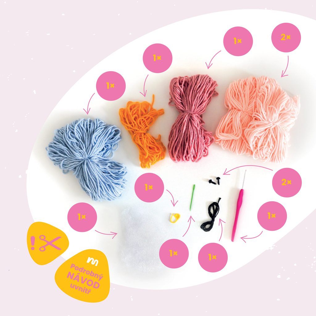 Nemusíte dumat nad tím, jakou přízi je potřeba použít, kolik jí nakoupit a v jakých barvách nebo který háček k ní budete potřebovat. Sada obsahuje vše, co budete potřebovat na uháčkování 1 roztomilého jednorožce. V balení najdete 1× krémovou, 1× světle modrou, 1× tmavě modrou, 1× růžovou a 1× vyšívací černou přízi, 1× háček na háčkování velikost 3, 1× plastový značkovač řad, 1× plastovou jehlu s velkým uchem, 2× bezpečnostní očička pro háčkovaná zvířátka, 1× výplň a podrobný postup na výrobu háčkovaného zvířátka i s fotografiemi. Pro výrobu budete dále potřebovat pouze nůžky, trochu trpělivosti a chuť tvořit.
