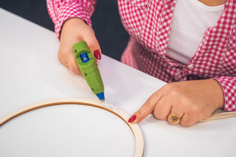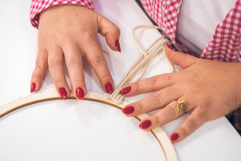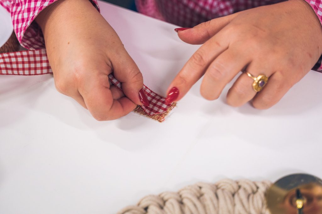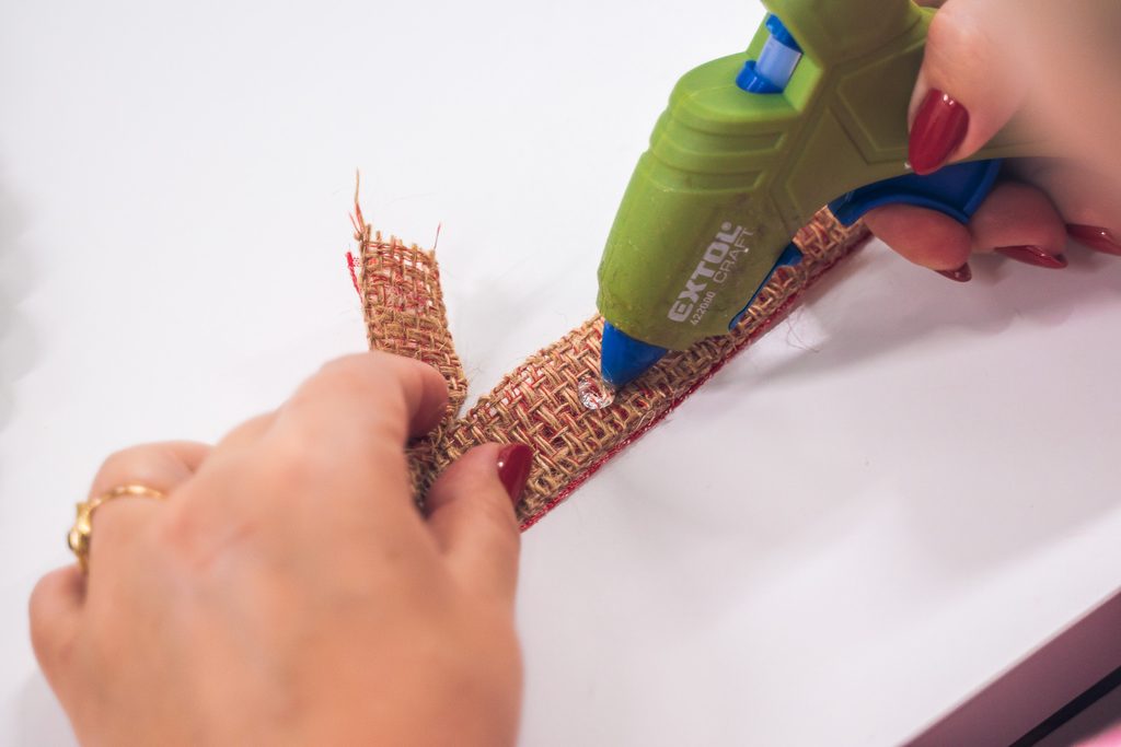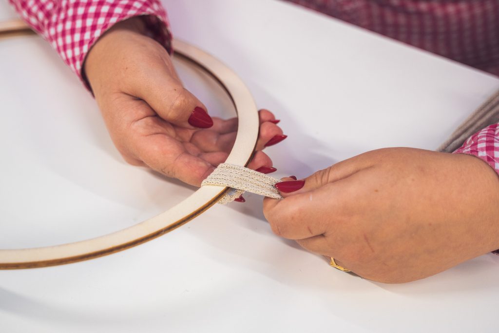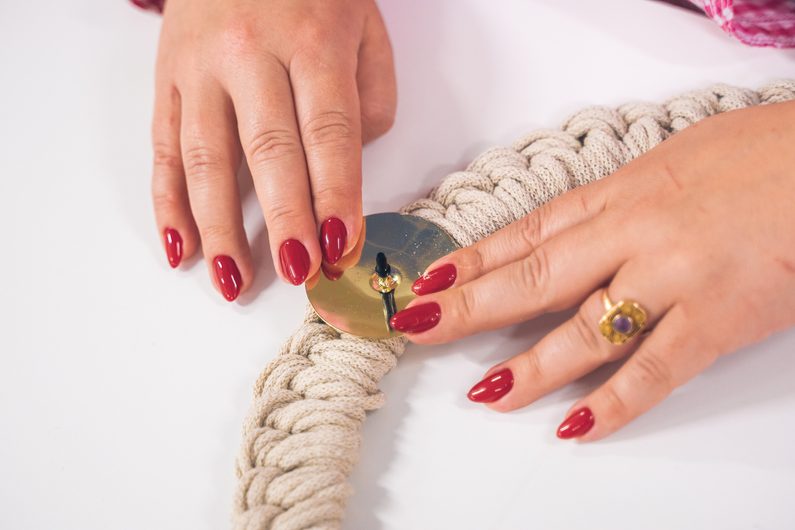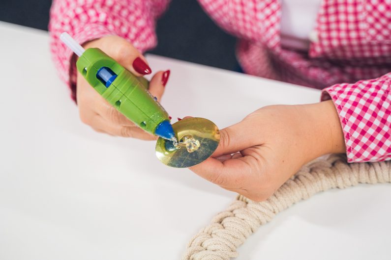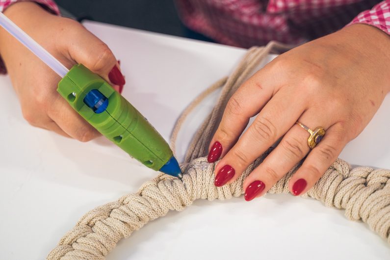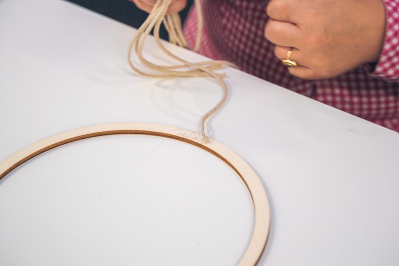 • Naměříme si 5 x 8 metrů macramé šňůry a jejich konce přilepíme tavnou pistolí na spodní stranu dřevěného kruhu.