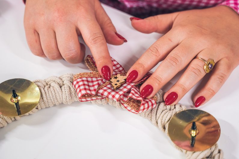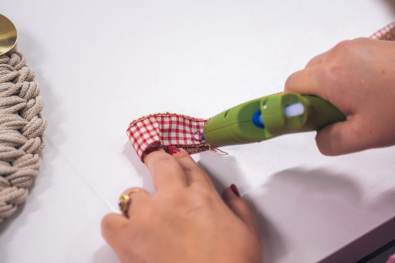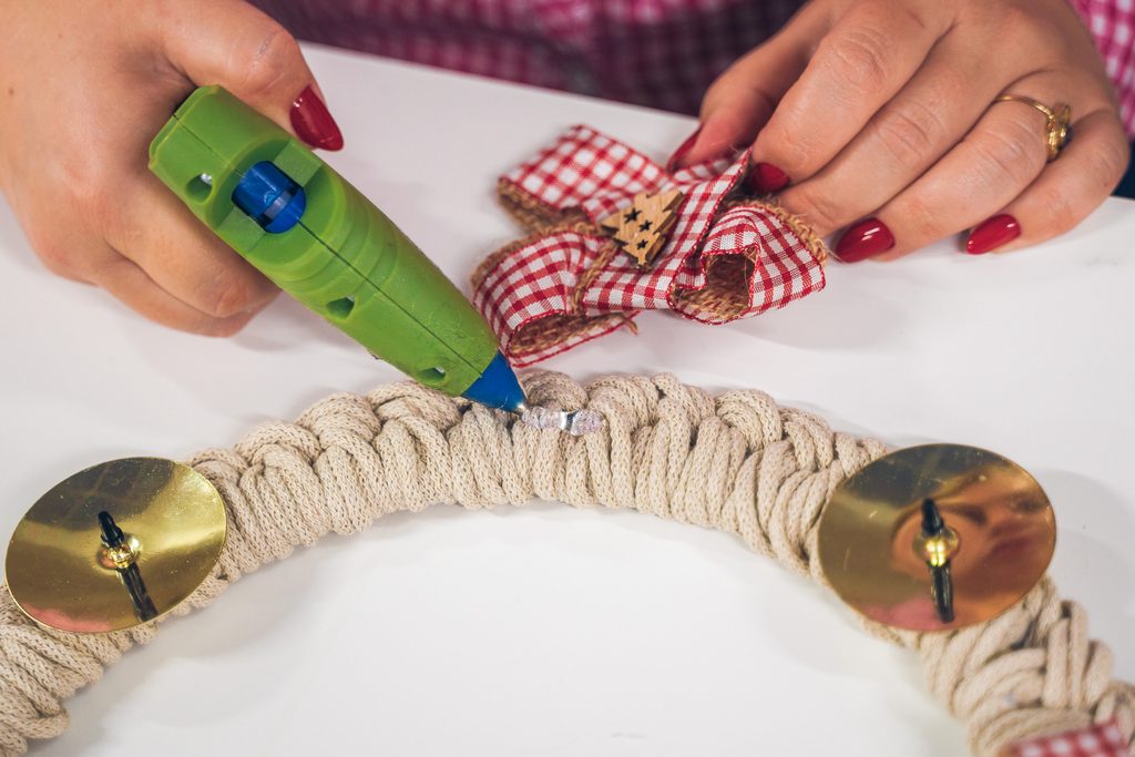 • Stejný uzel opakujeme po celém obvodu věnce. Na konci opět příze přilepíme tavnou pistolí.