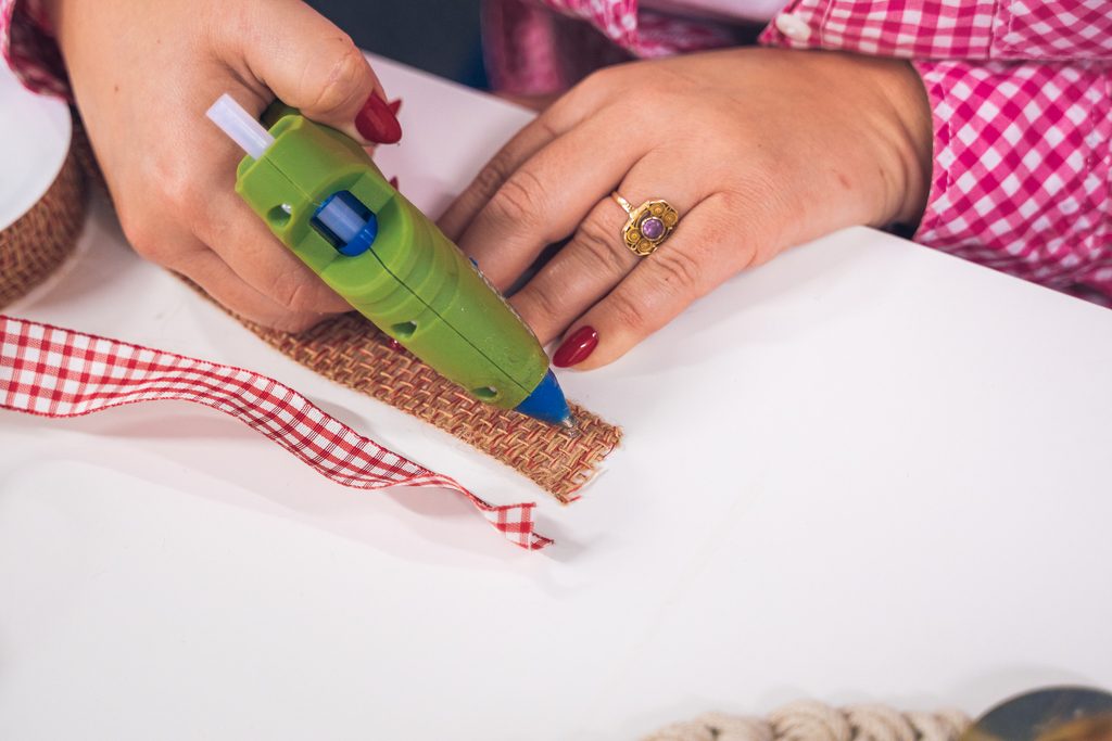 • Mezi držáky si připravíme ozdobné mašle. Pokud je nechcete vázat, můžete si i zde pomoci tavnou pistolí. Na jednu mašli je potřeba 50 cm přírodní a kostkované stuhy, které k sobě slepíme. Poté vždy přilepíme sklad v mašli.