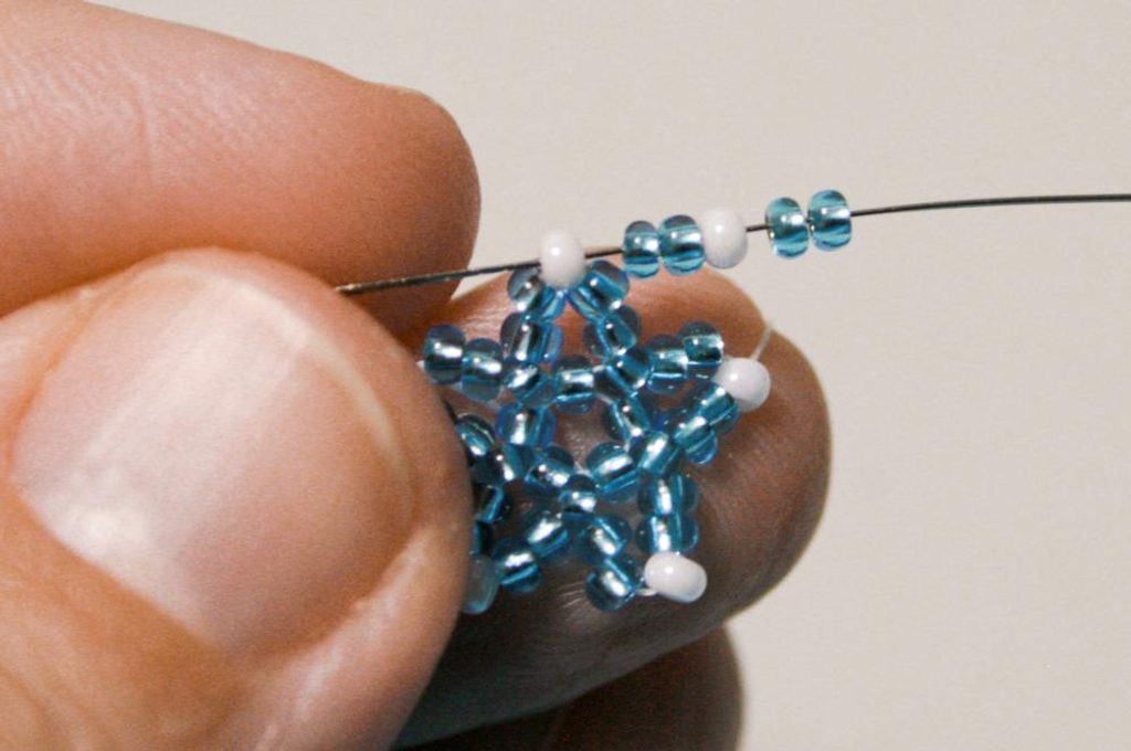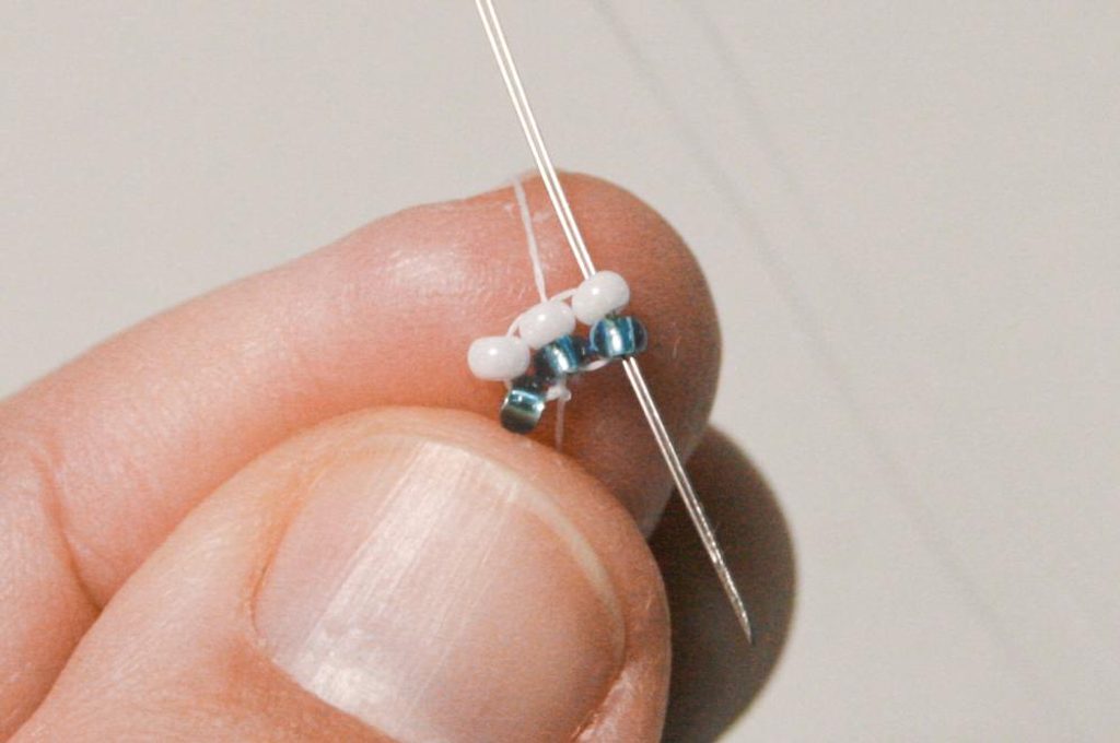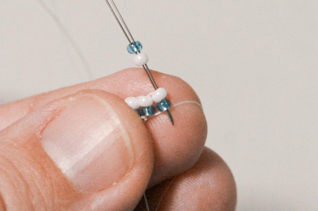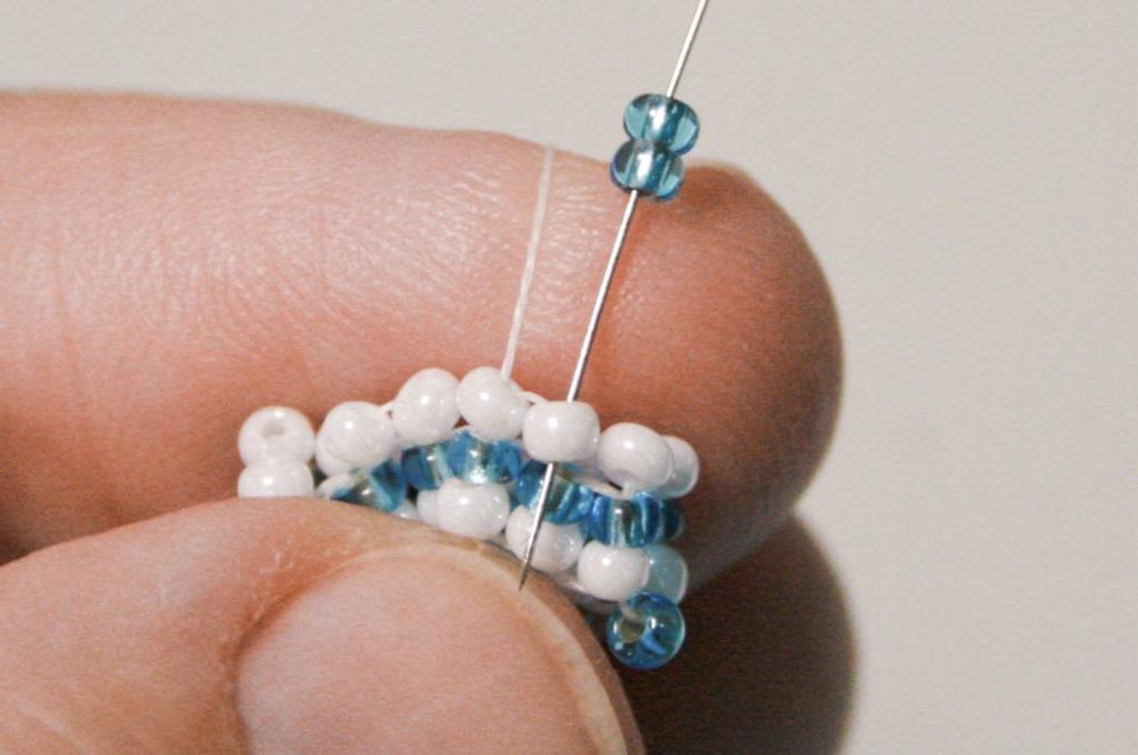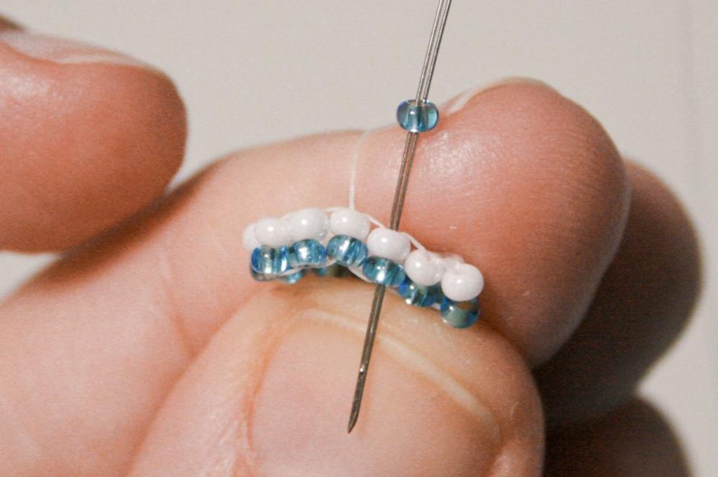 Vyjděte v jednom ze spodních korálků a navléknete korálky v tomto pořadí:
