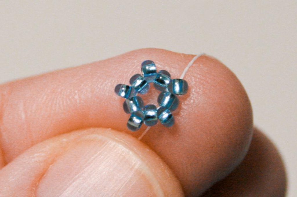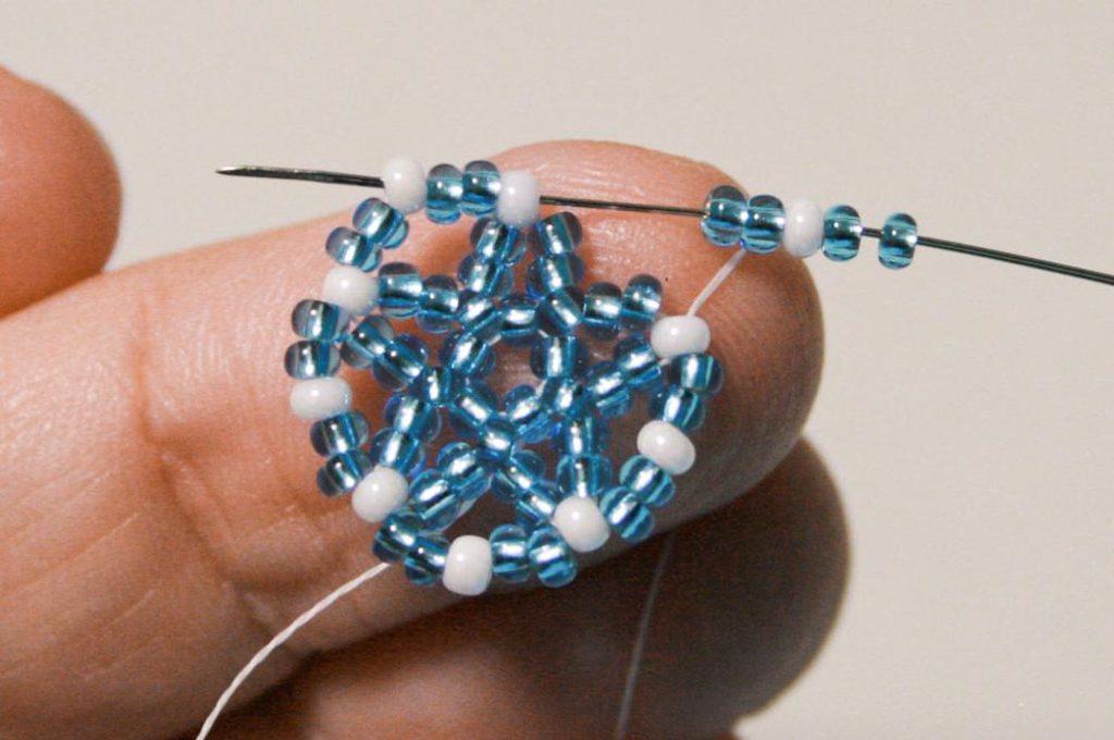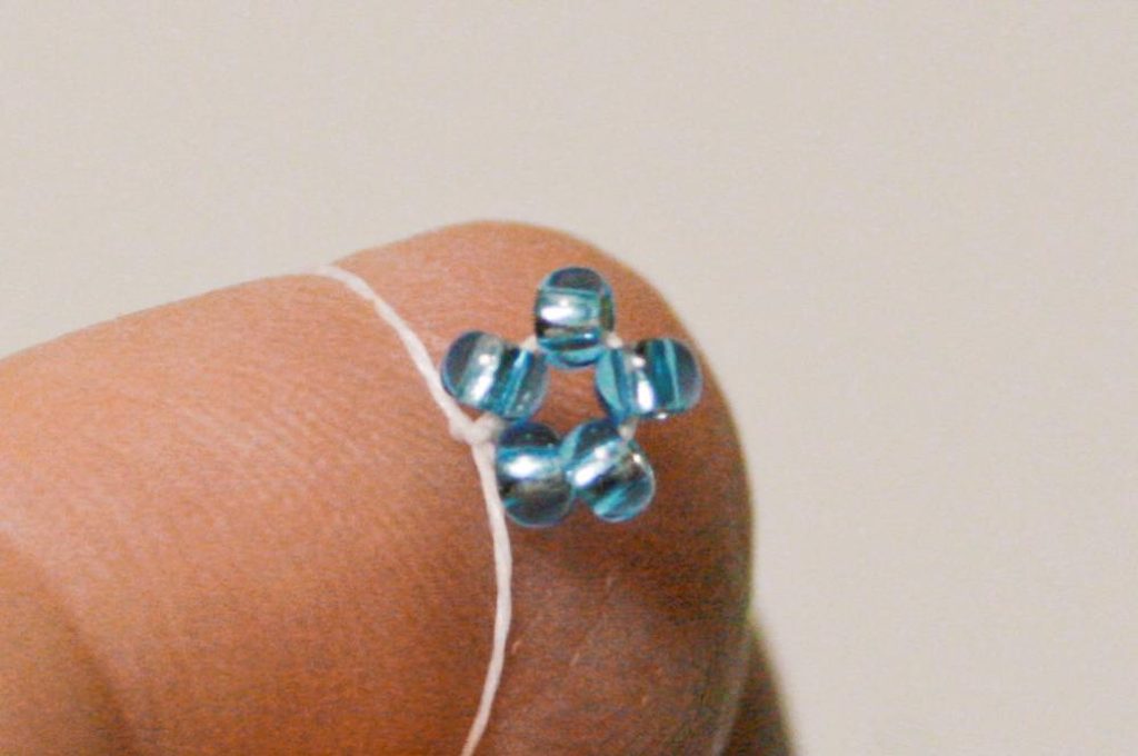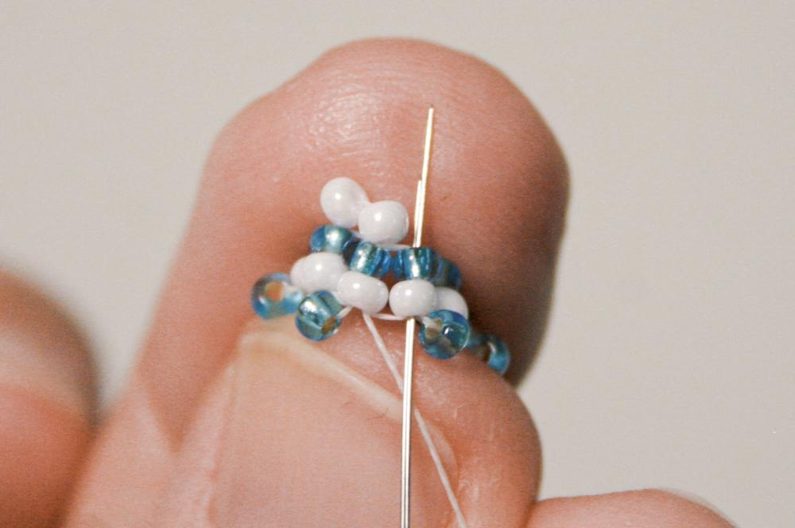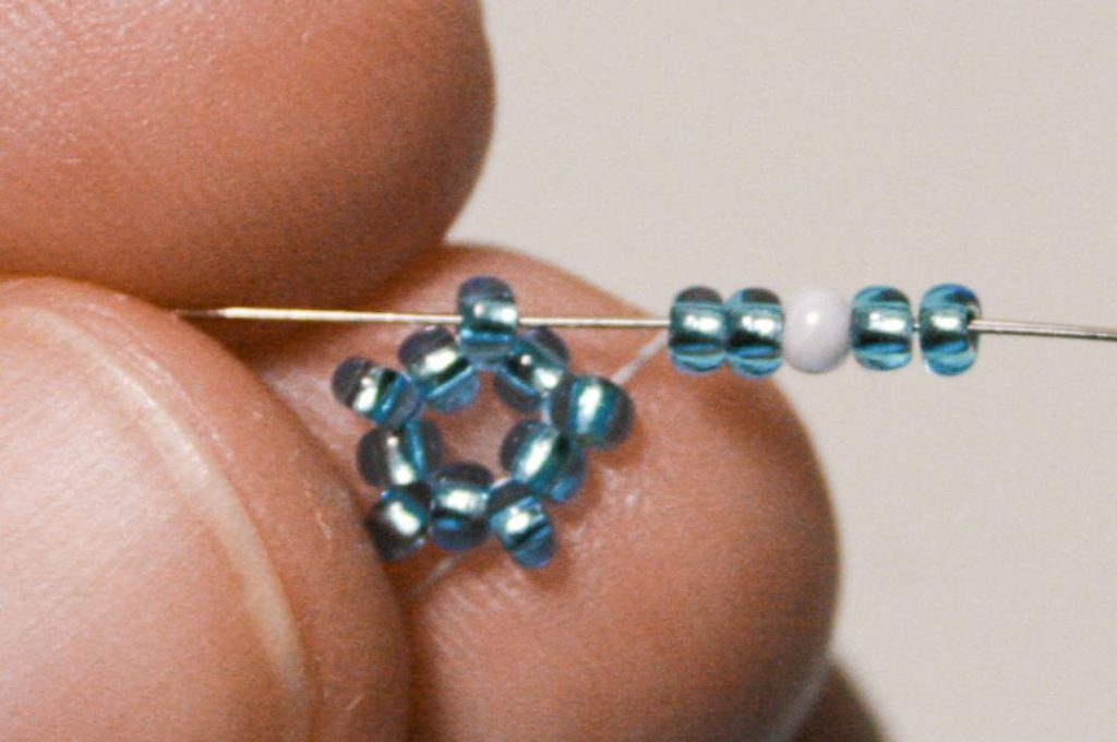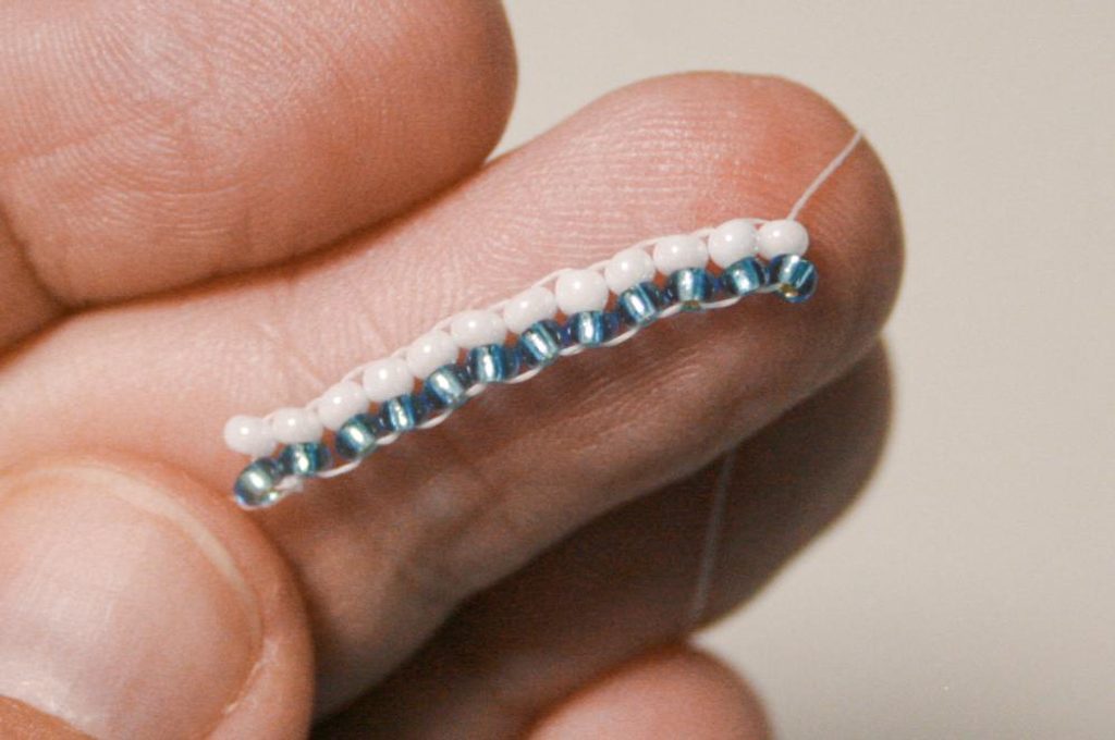 Vyjděte v jednom ze spodních korálků a navléknete korálky v tomto pořadí: