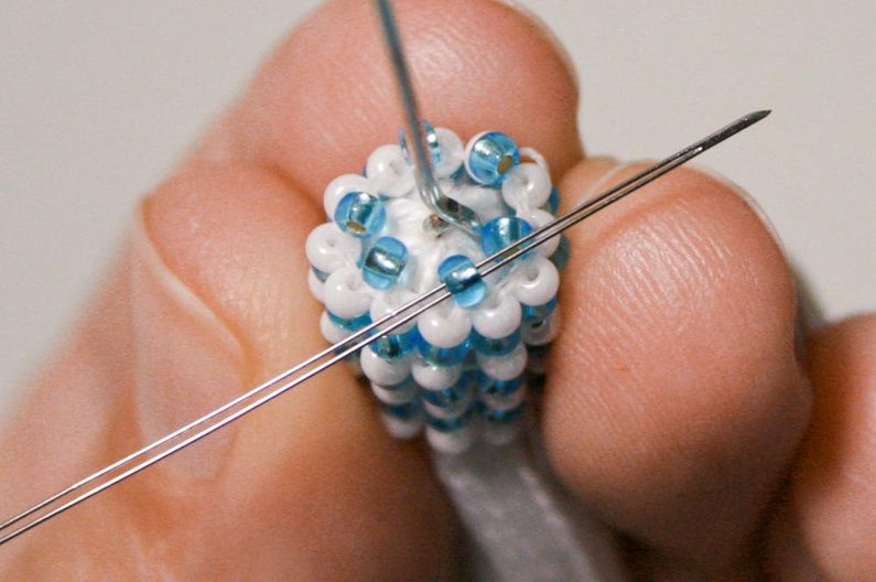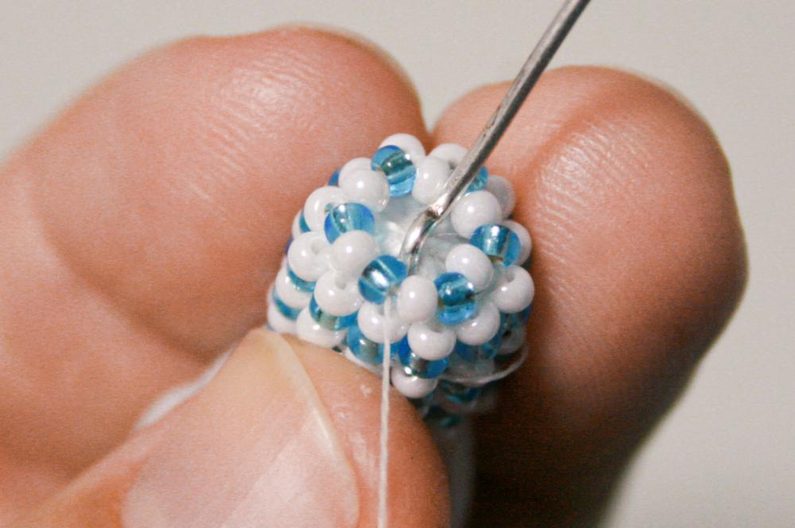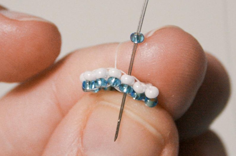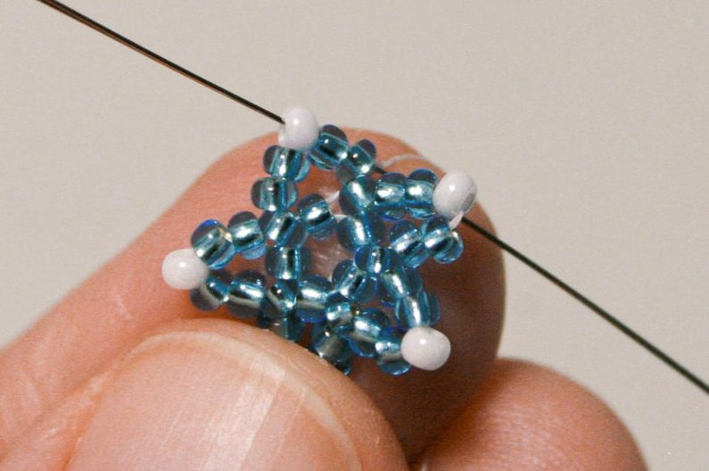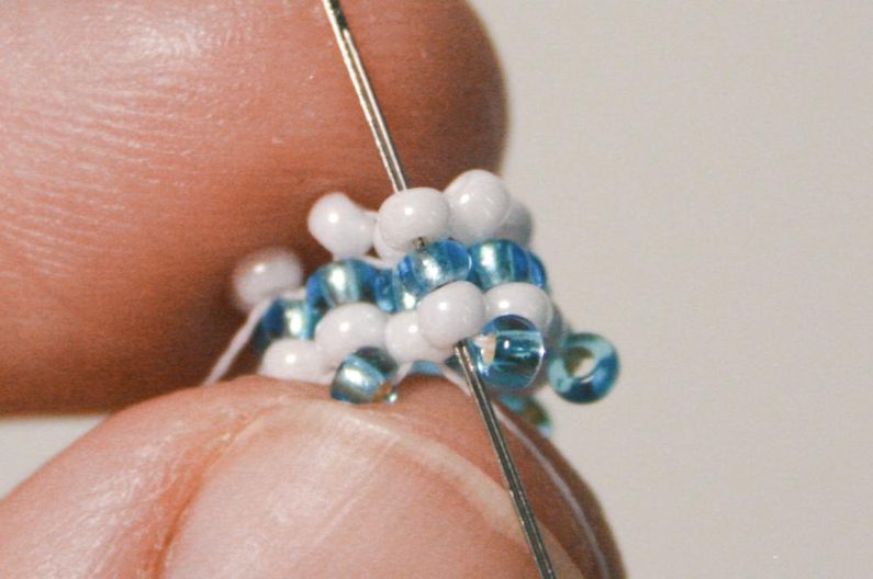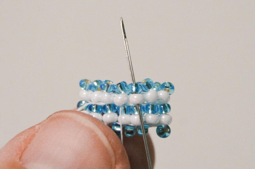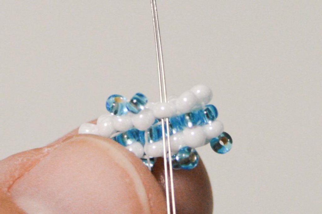 Vyjděte v jednom z korálků PRb, navléknete korálek PRa a projděte skrz sousední korálek PRb (obr.14 - 15), opakujte postup pětkrát (obr. 16).