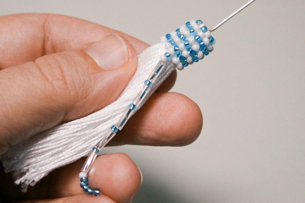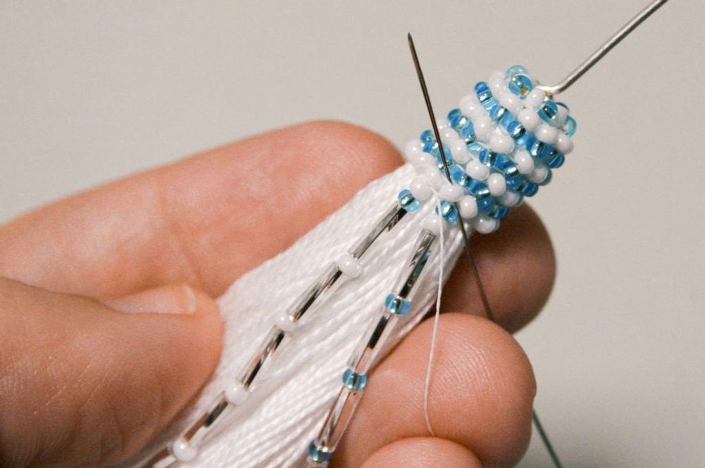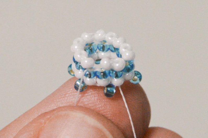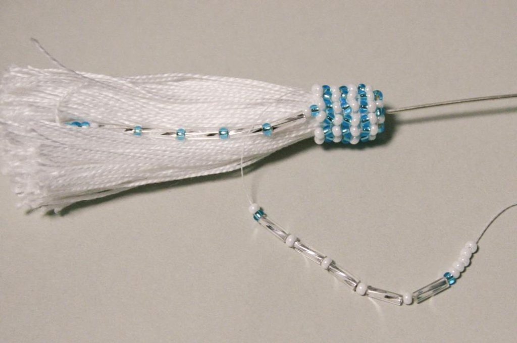 Vyjděte skrz přidané korálky směrem dospod (obr. 9).
