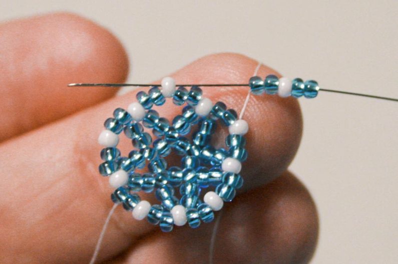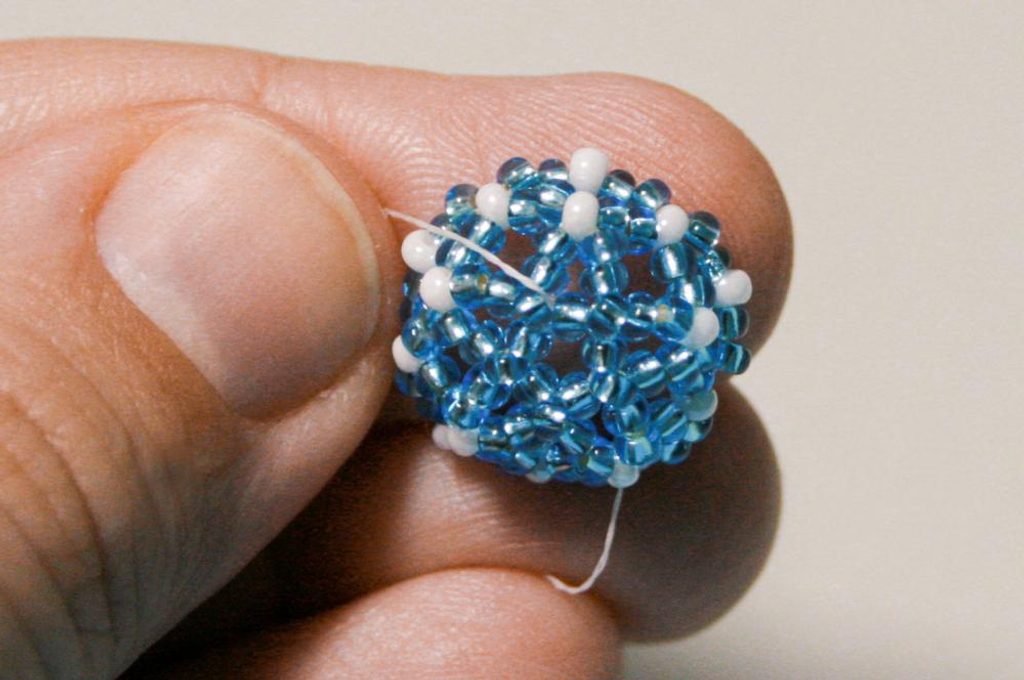 Vyjděte skrz sousední korálky (obr. 22), opakujte postup dokola (obr. 23). Ušijte tímto způsobem dokola celkem 7 řad (obr. 24).
