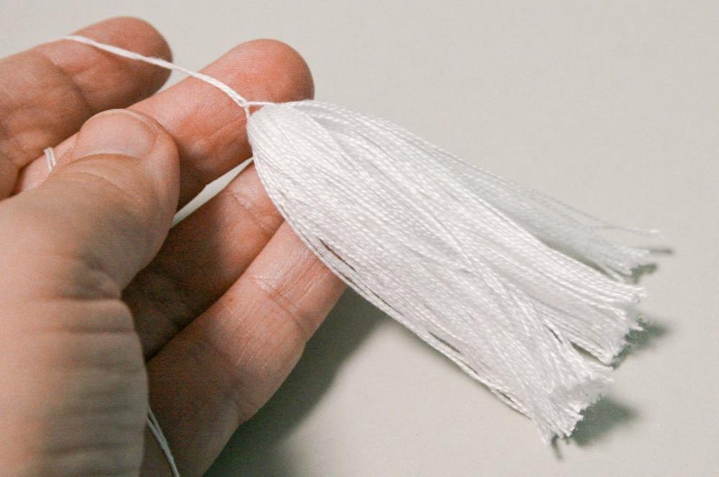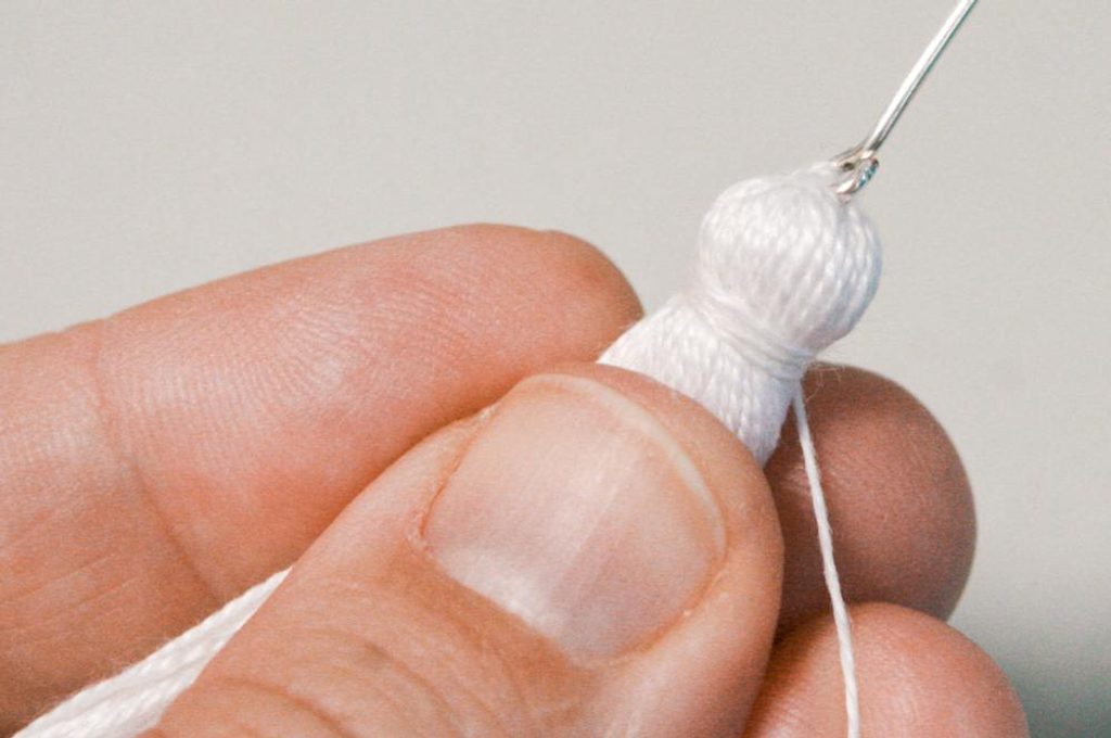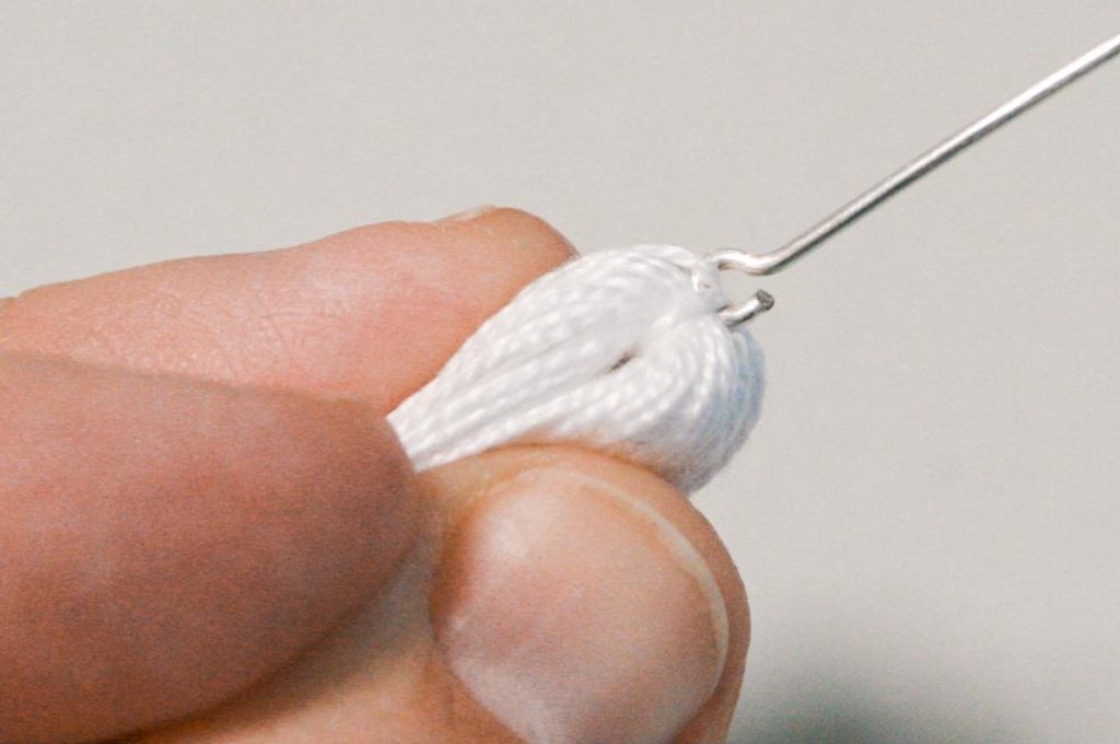 Zavažte otočky kusem příze (obr. 2), přestřihněte konce příze (obr. 3).