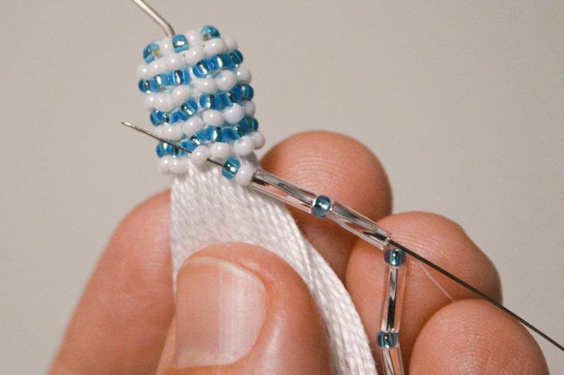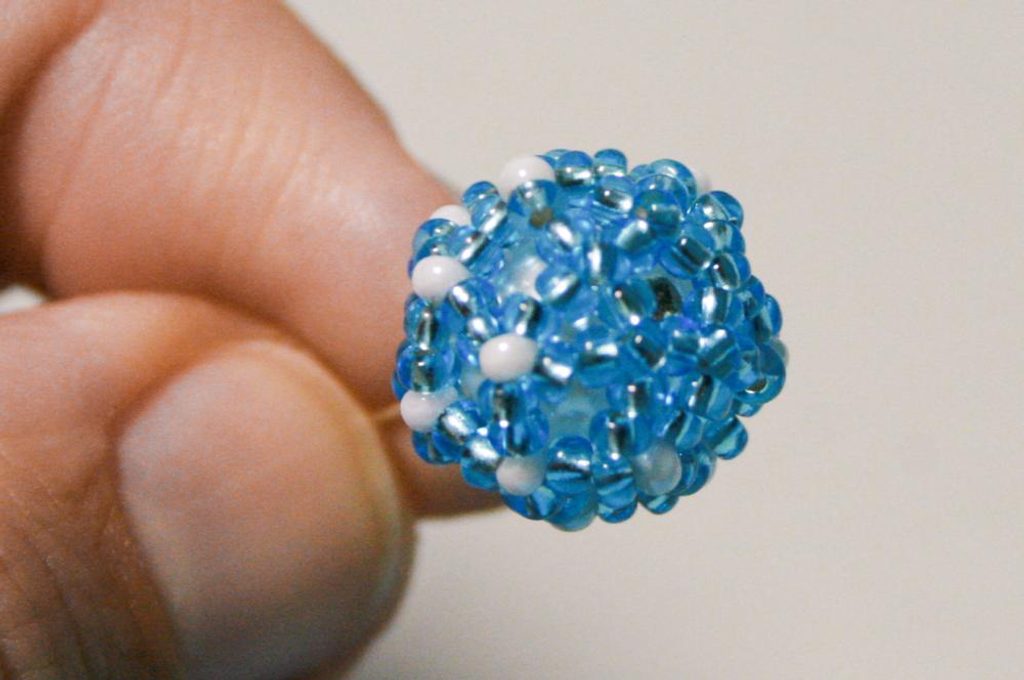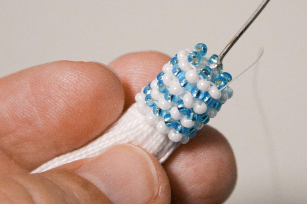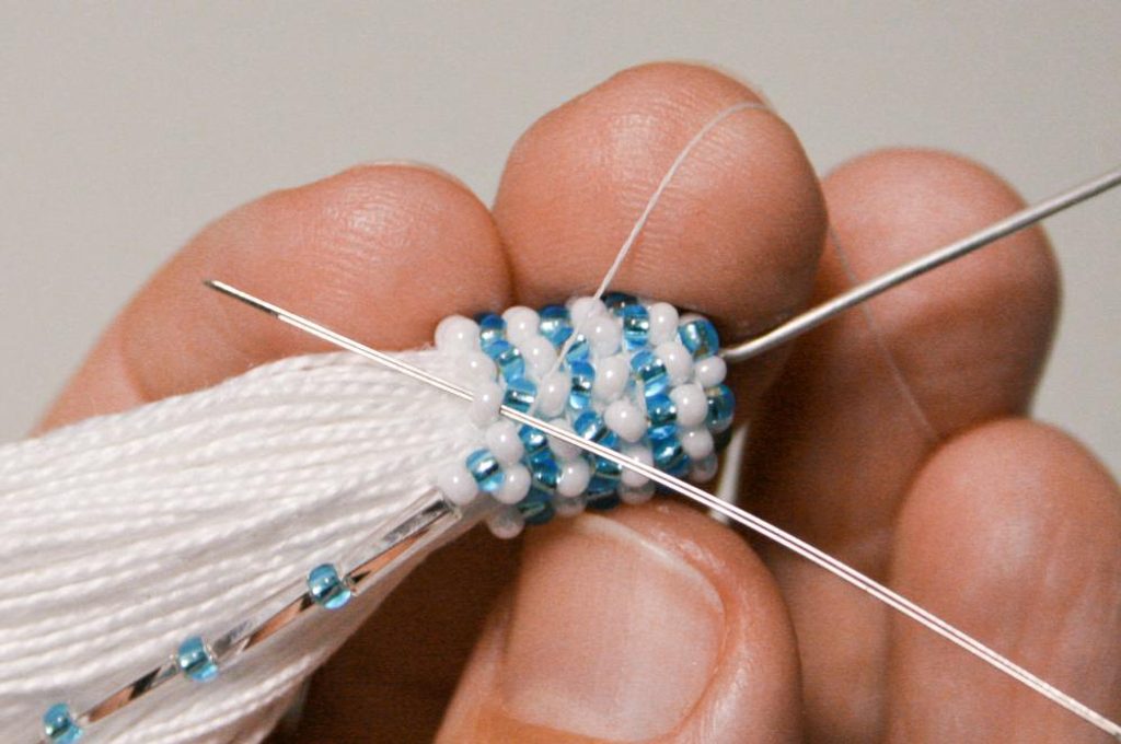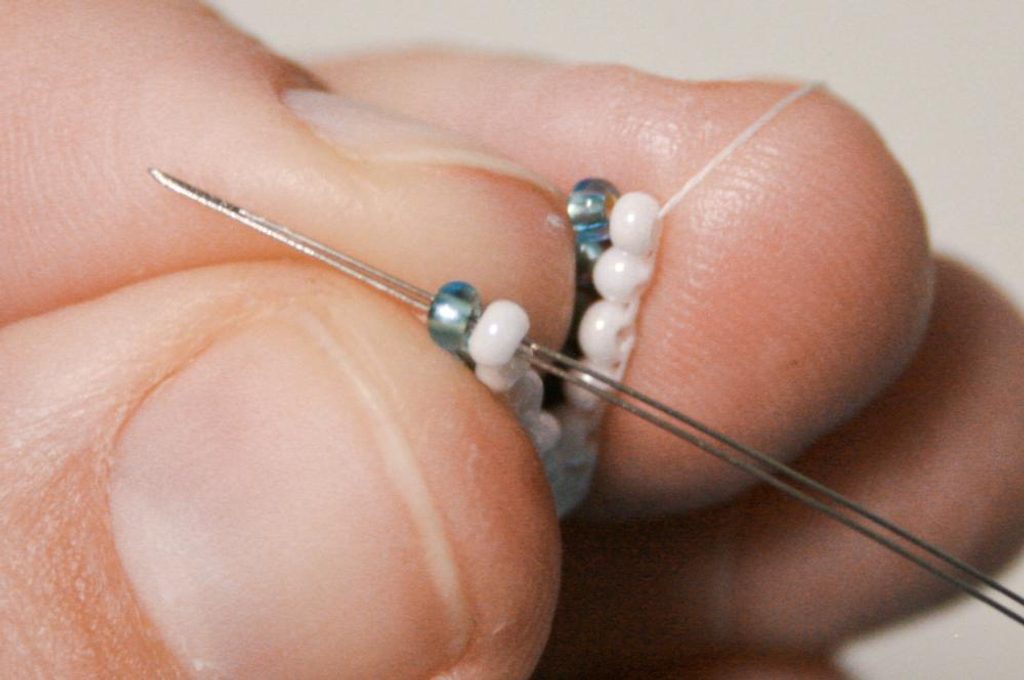 Mezi každým korálkem první řady všijte po jednom korálku druhé řady (obr. 35).