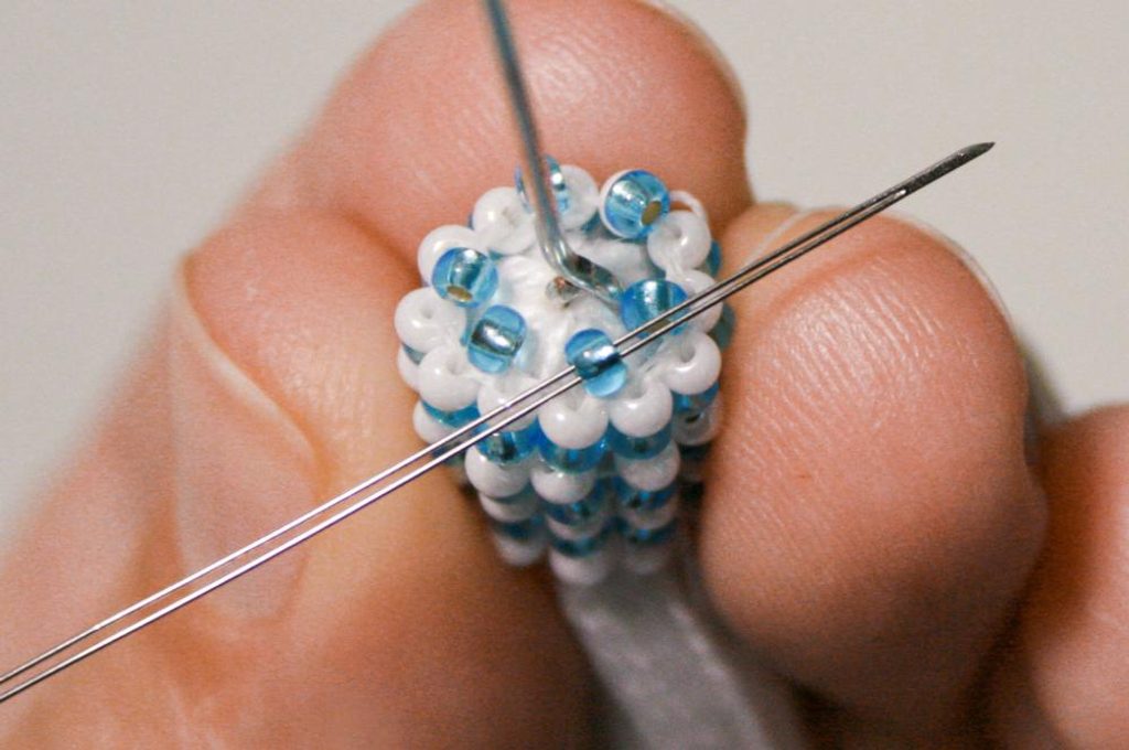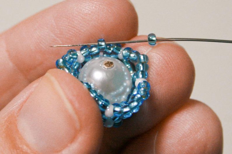 Vyjděte skrz sousední korálky (obr. 18), opakujte postup dokola (obr. 19).