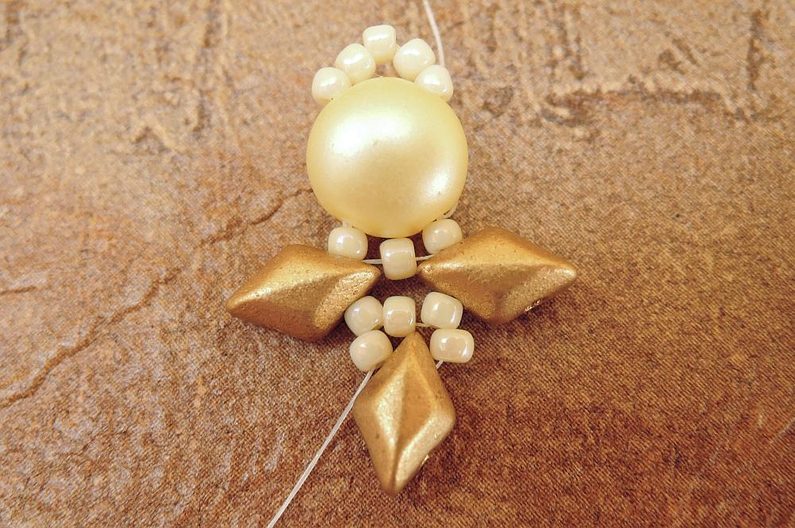 Navlékněte 3 TR11, 1 MGD, prošijte spodní dírku v MGD předchozího kroku, opět navlékněte 1 MGD a 3 TR11 a prošijte zprava doleva horní dírku v MGD předchozího kroku.