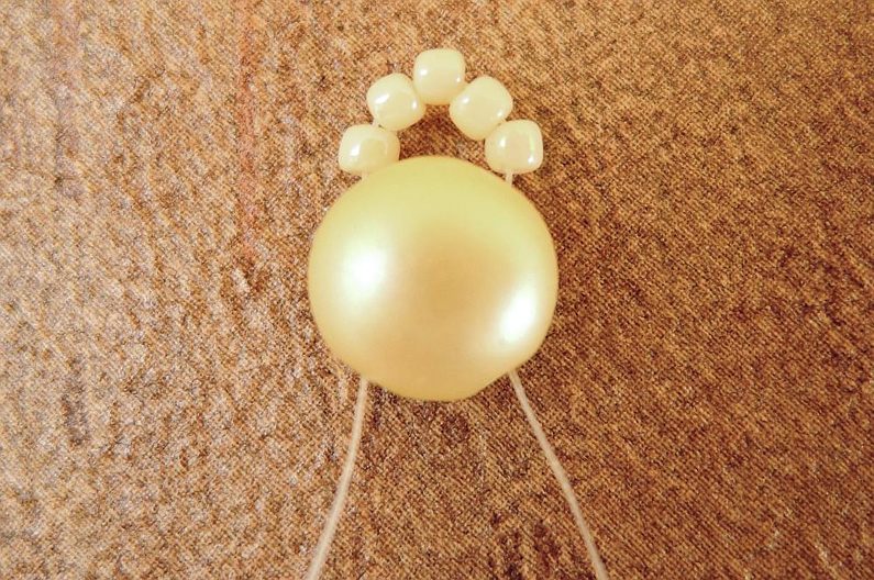 Ustřihněte si cca 60 cm Fireline. Navlékněte jehlu a prošijte pravou dírku PC8 směrem nahoru. Na spodní straně si nechte cca 10 cm Fireline na zapošití. Nyní navlékněte 5 TR11 a vraťte se druhou dírkou směrem dolů přes PC8. Navlékněte 3 TR11 a znovu prošijte kompletně PC8 i předchozích 5 TR11 až skončíte v první TR11 z nově přidané trojice.