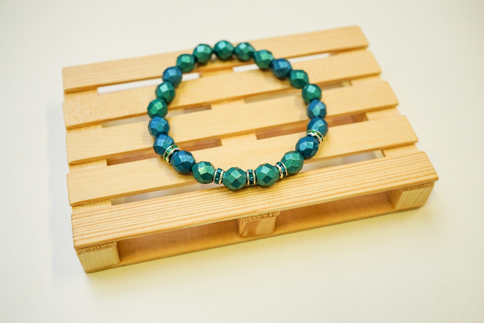 A poté navlékáme broušené korálky a štrasové rondelky dle obrázkového vzoru.