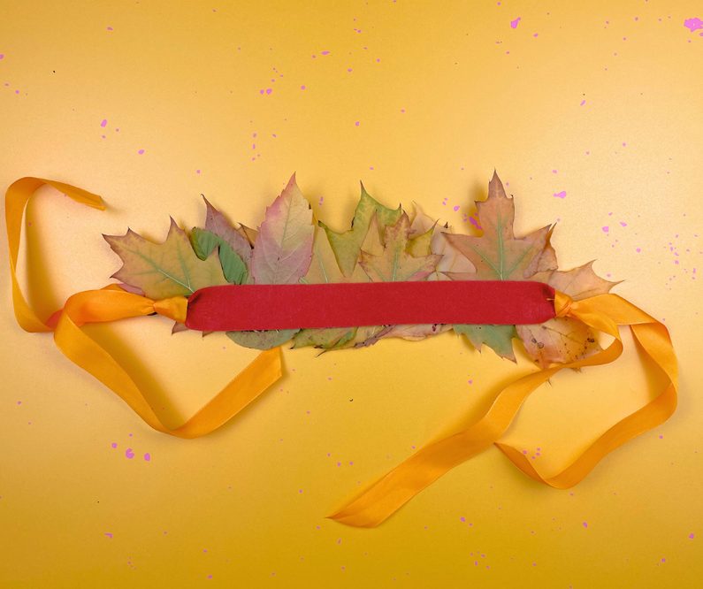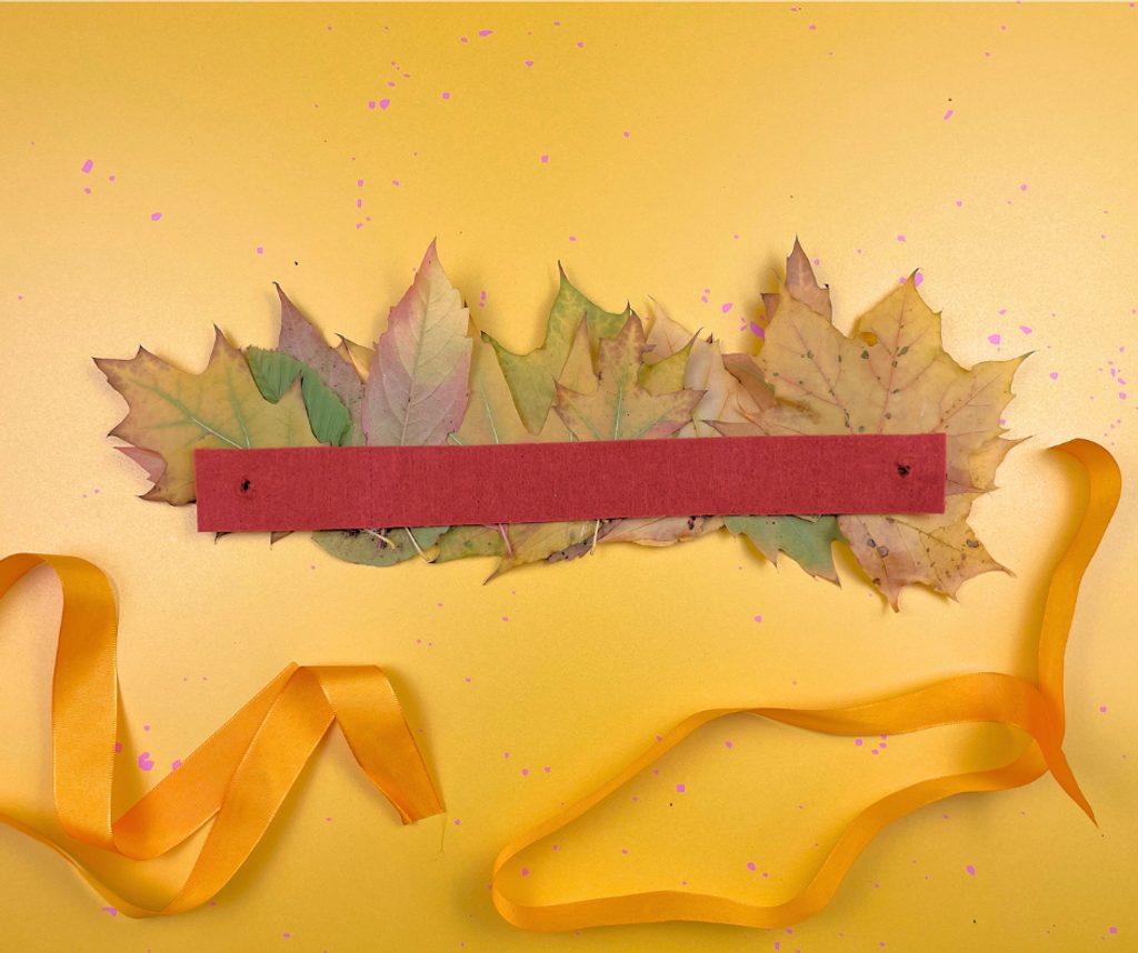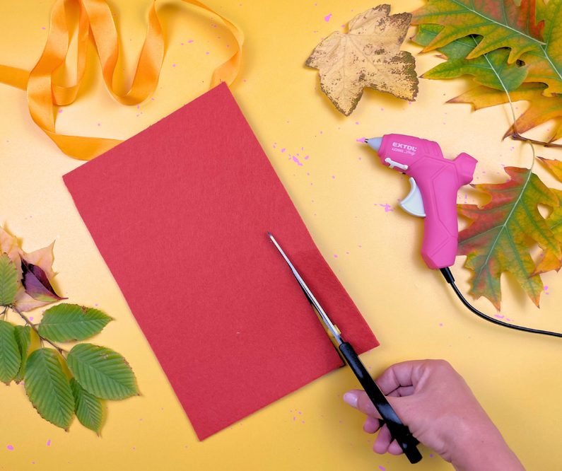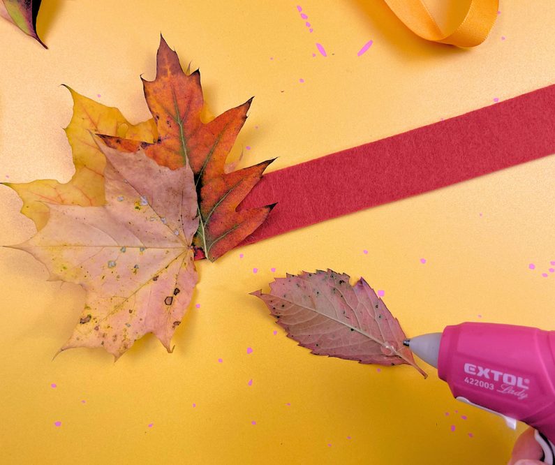 Na ustříhnutý kousek plstě postupně tavnou pistolí nalepte různé druhy podzimního listí, které předtím zbavte “nožiček.” Listy k sobě lepte velmi hustě, aby finální efekt korunky byl co nejlepší.