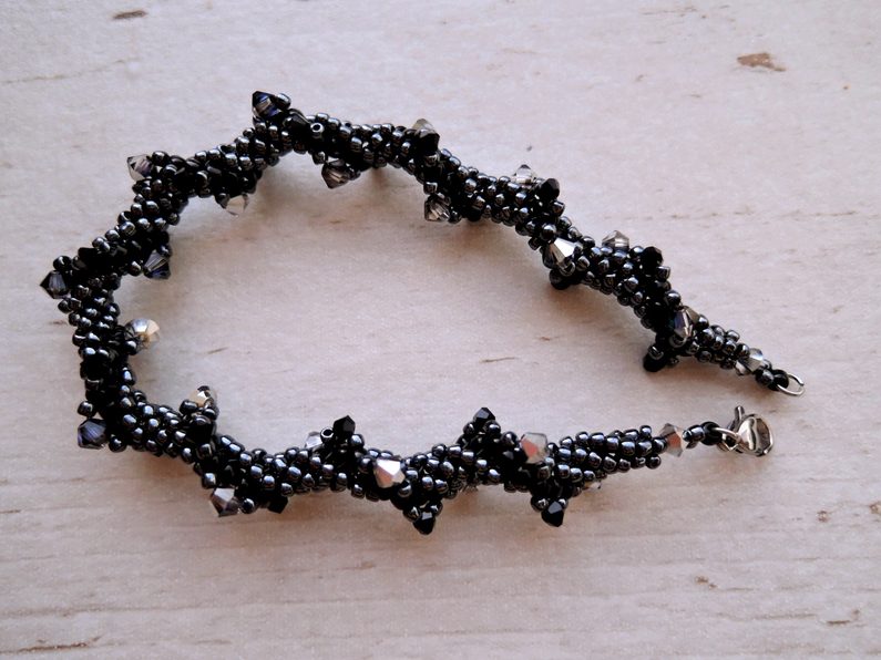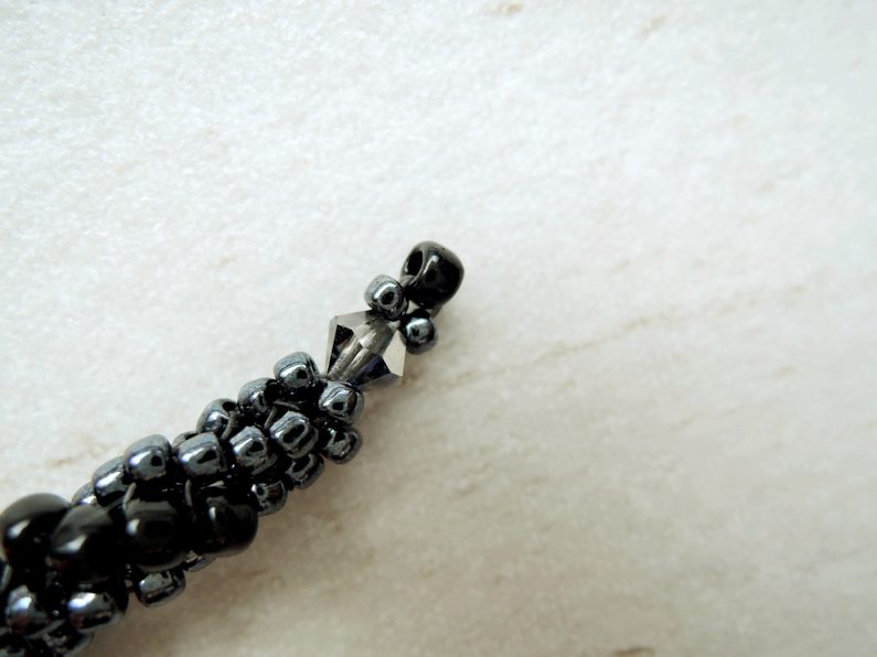 Na náramek postupujte stejně, šijte do délky 18,5 cm, zakončete oba konce stejně jako u náhrdelníku i náušnic a proveďte zdobení po celé délce TR8. Do jednoho TR8 na zakončení navlékněte spojovací kroužek a karabinku, do druhého pouze spojovací kroužek. Výsledná délka celého náramku je cca 22 cm