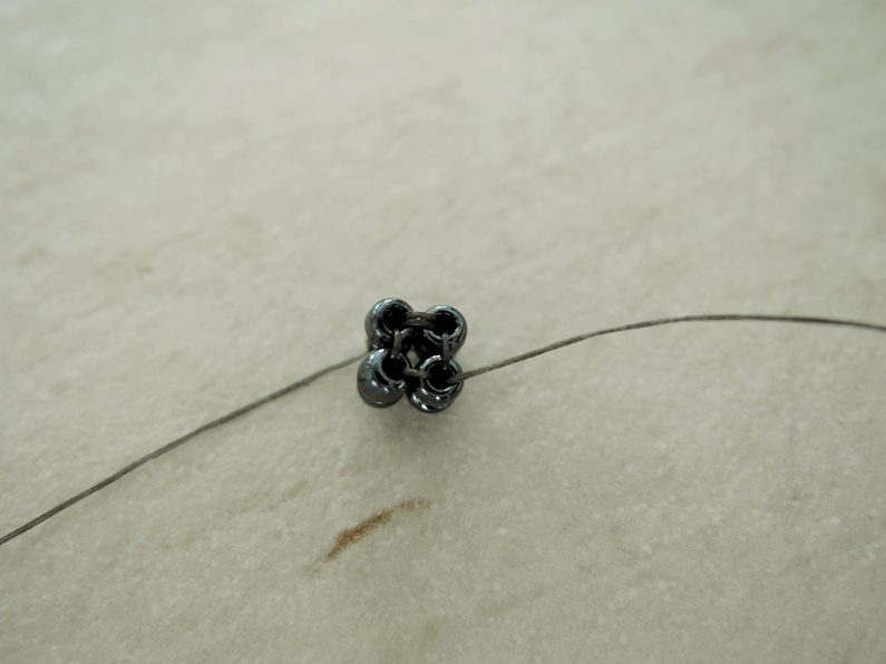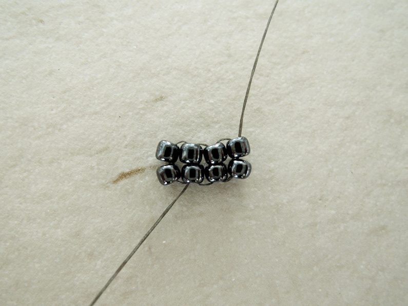 Na co nejdelší Fireline Smoke navlékněte jehlu a 4 TR11. Prošijte dvojici TR11 tak, aby vznikl čtvereček