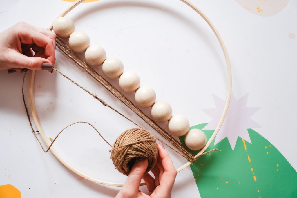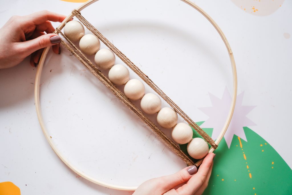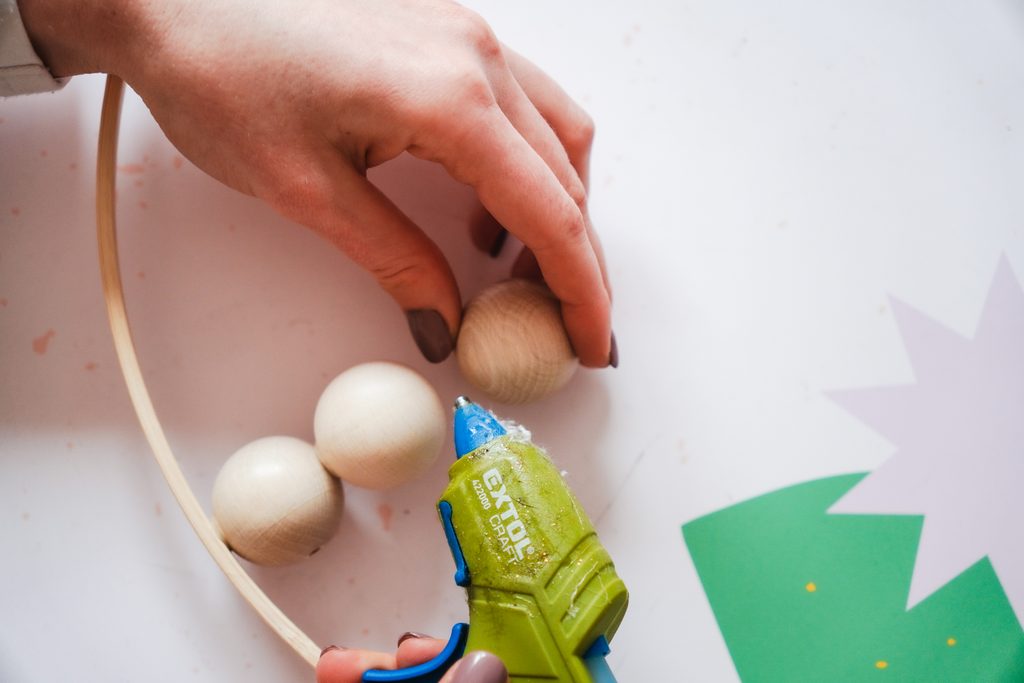 Pomocí tavné pistole přilepíme do vnitřku kruhu dřevěné korálky hezky do řady vedle sebe tak, aby průtahy korálků směřovaly vertikálně.