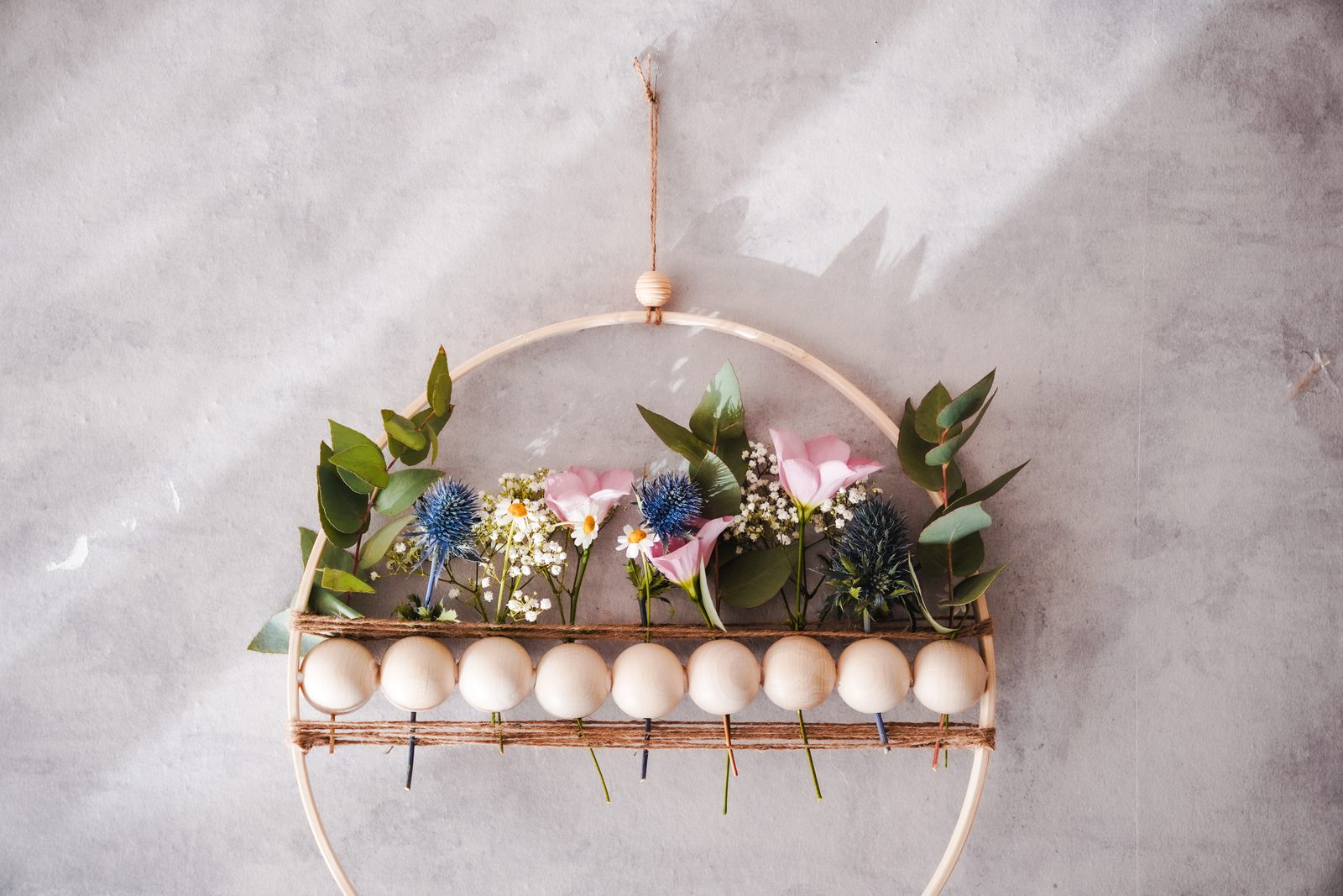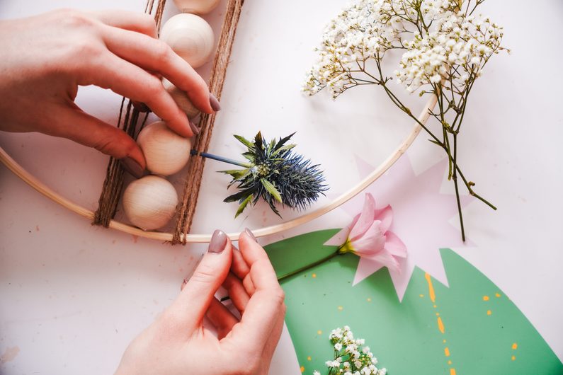 Provázek nám pomůže udržet květiny, které postupně zapícháme do průtahů korálků. Na konec přiděláme provázek pro zavěšení, můžeme ozdobit menším, dřevěným korálkem.
