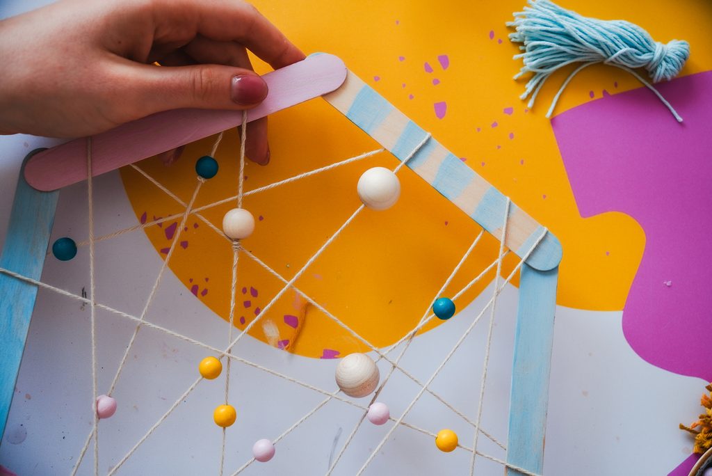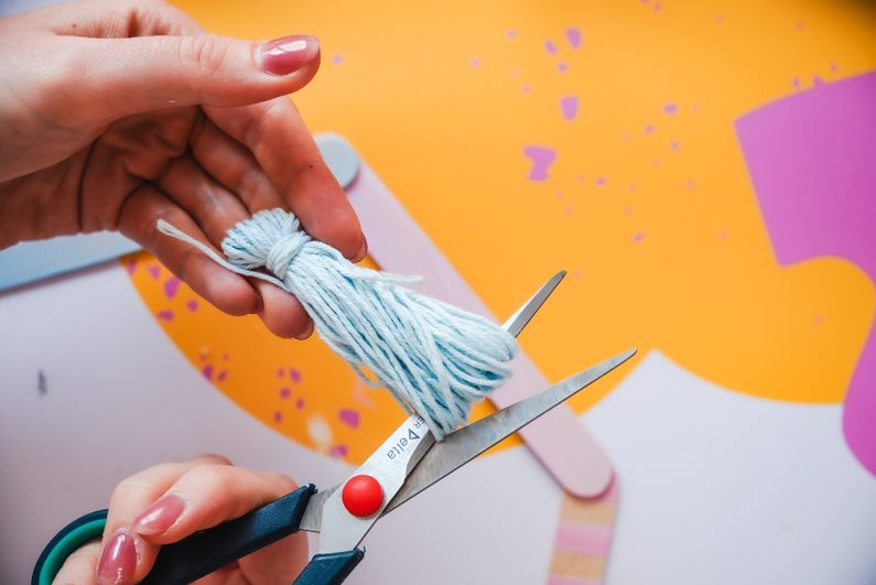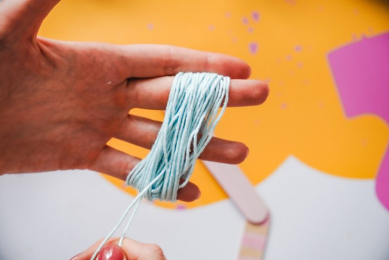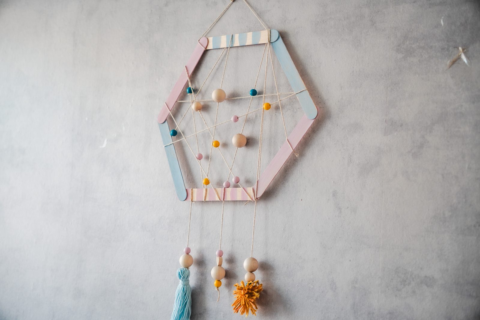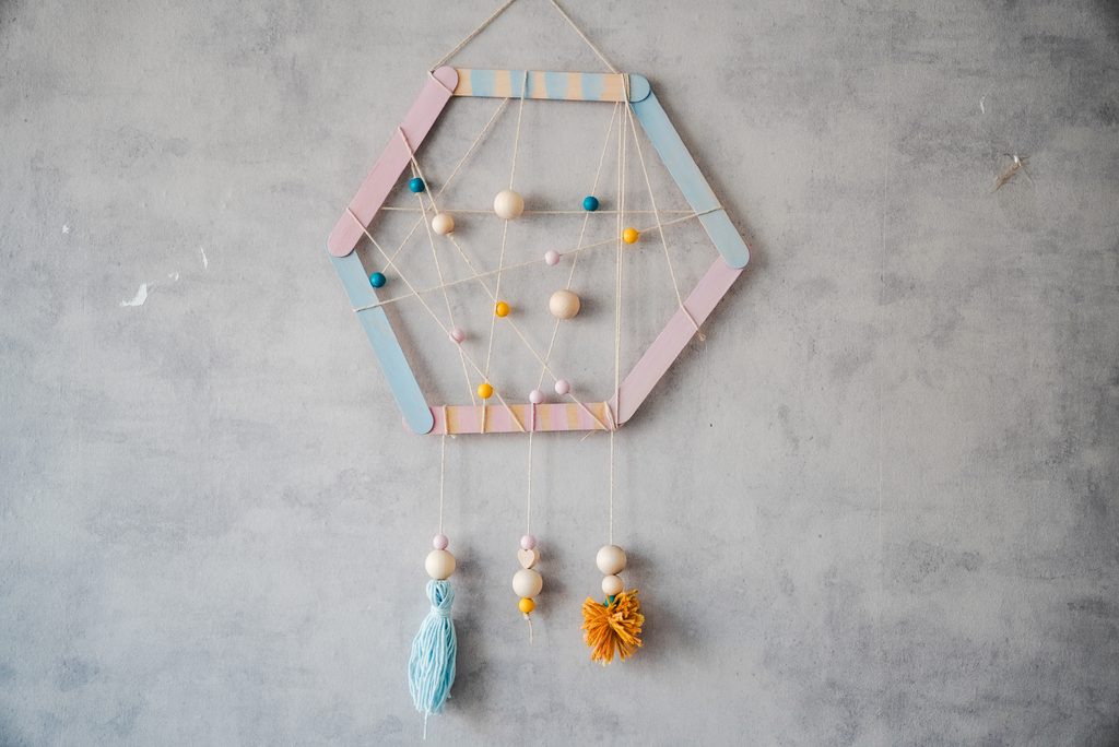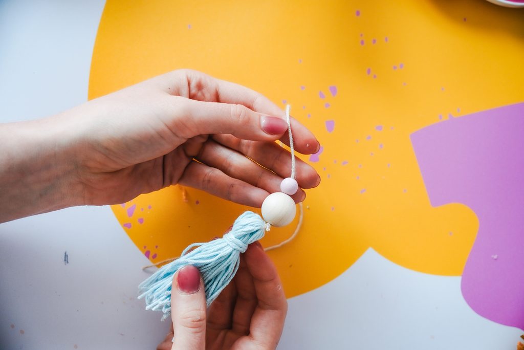Následně si vyrobíme střapec z modré příze. Zkombinujeme s dřevěnými korálky a připevníme k hexagonu.