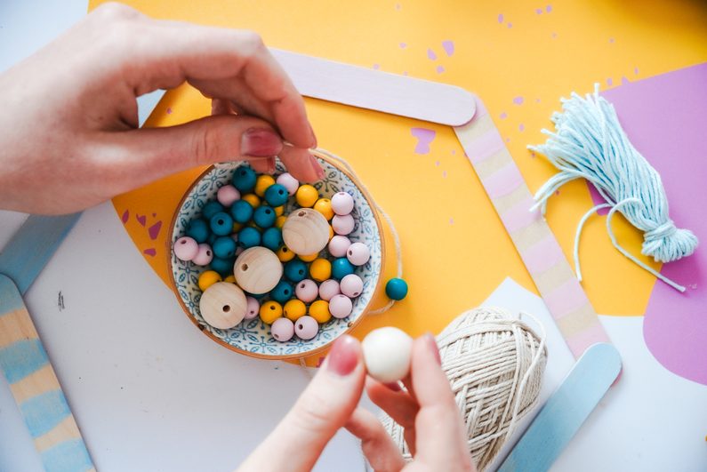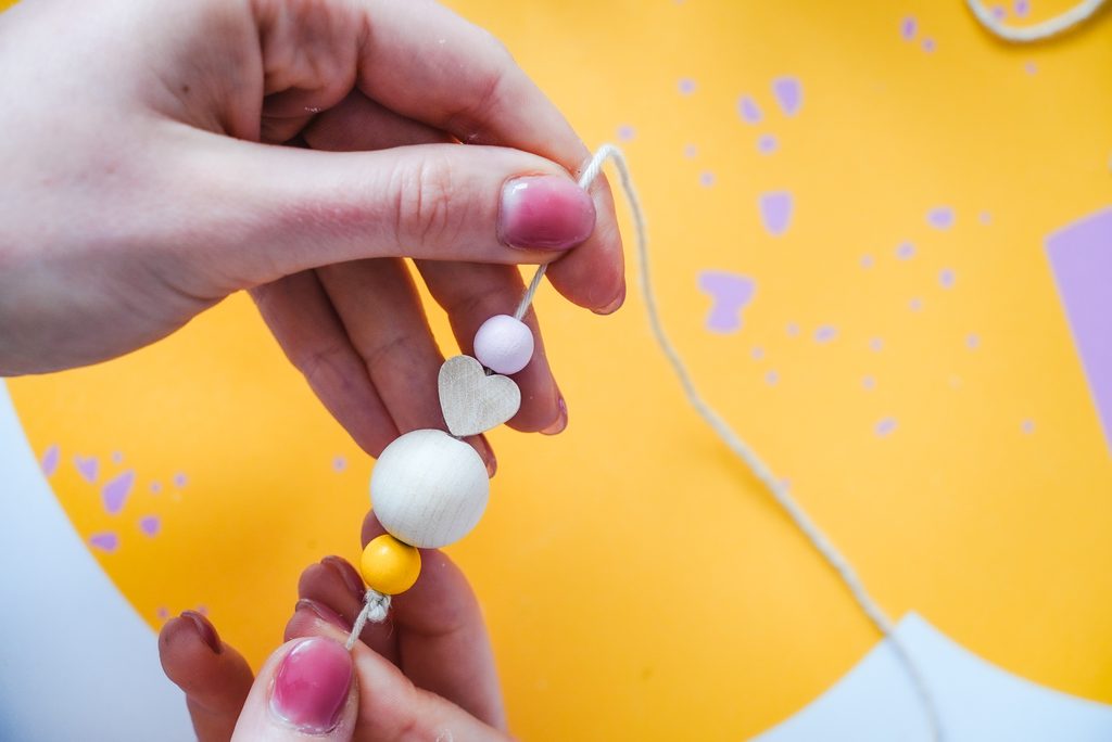 Na krémovou přízi si navlékneme dřevěné korálky, střídáme velikosti i barvy.