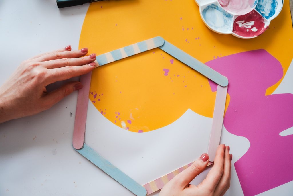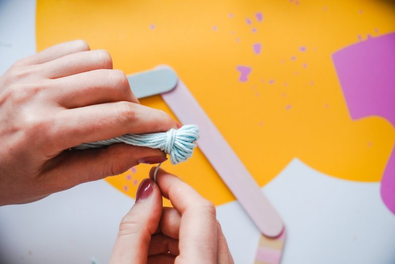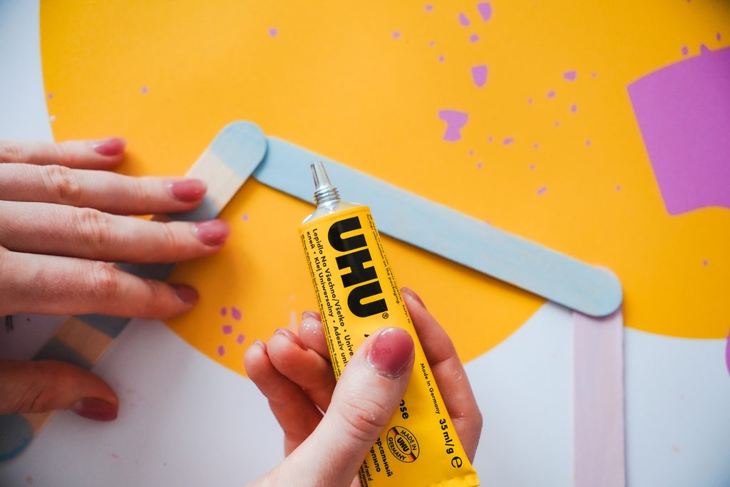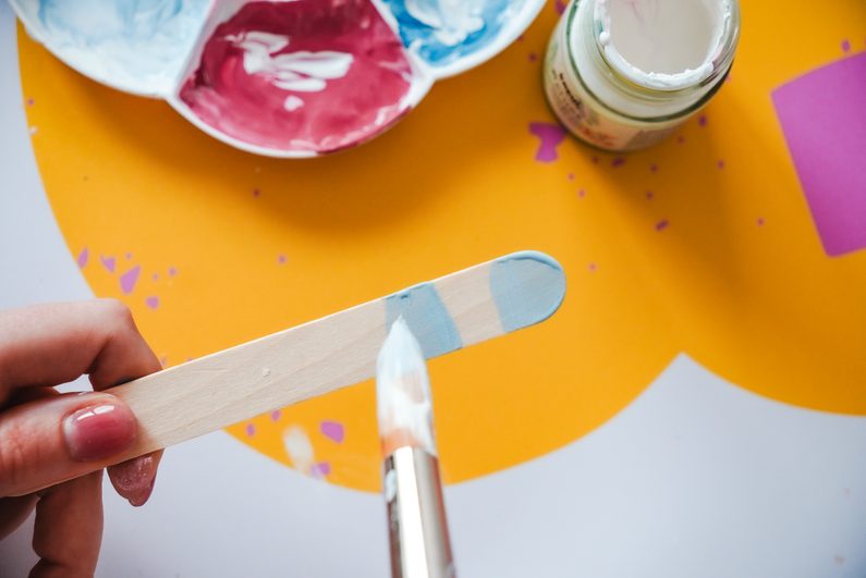 Dřevěné špachtle obarvíme z jedné strany pomocí akrylových barev tak, jak se nám to líbí. Můžeme si vybrat vlastní kombinaci barev i vzorů. My jsme použili světle modrou a růžovou a zvolili jsme proužky.