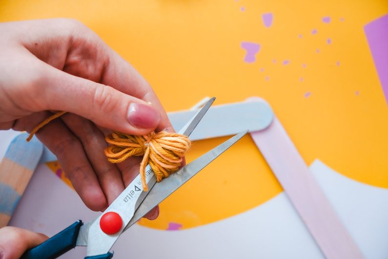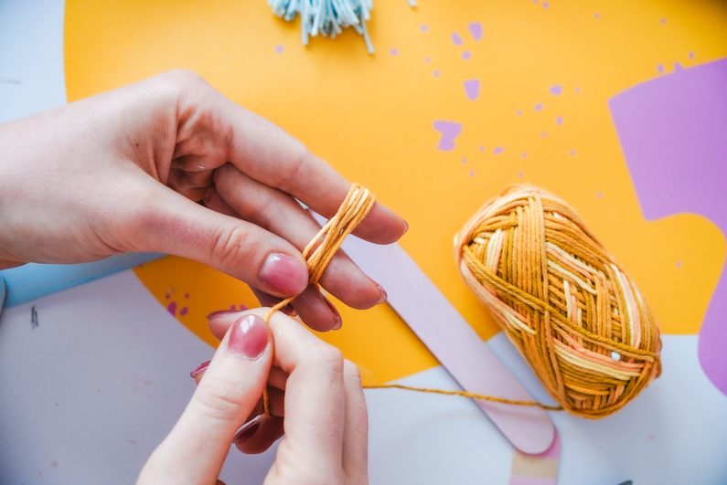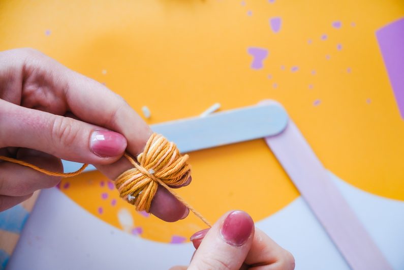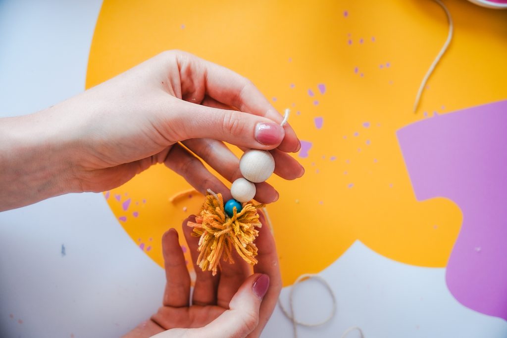 Následně si vyrobíme bambuli ze žluté příze. Zkombinujeme s dřevěnými korálky a připevníme k hexagonu.