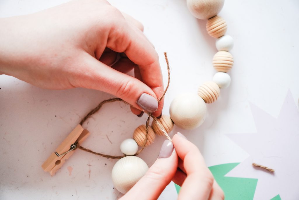 • Pomocí jutového provázku přivážeme kolíčky a je to. Girlandu můžeme zavěsit na zeď, poličku, nebo okno a na kolíčky připnout oblíbené fotografie.