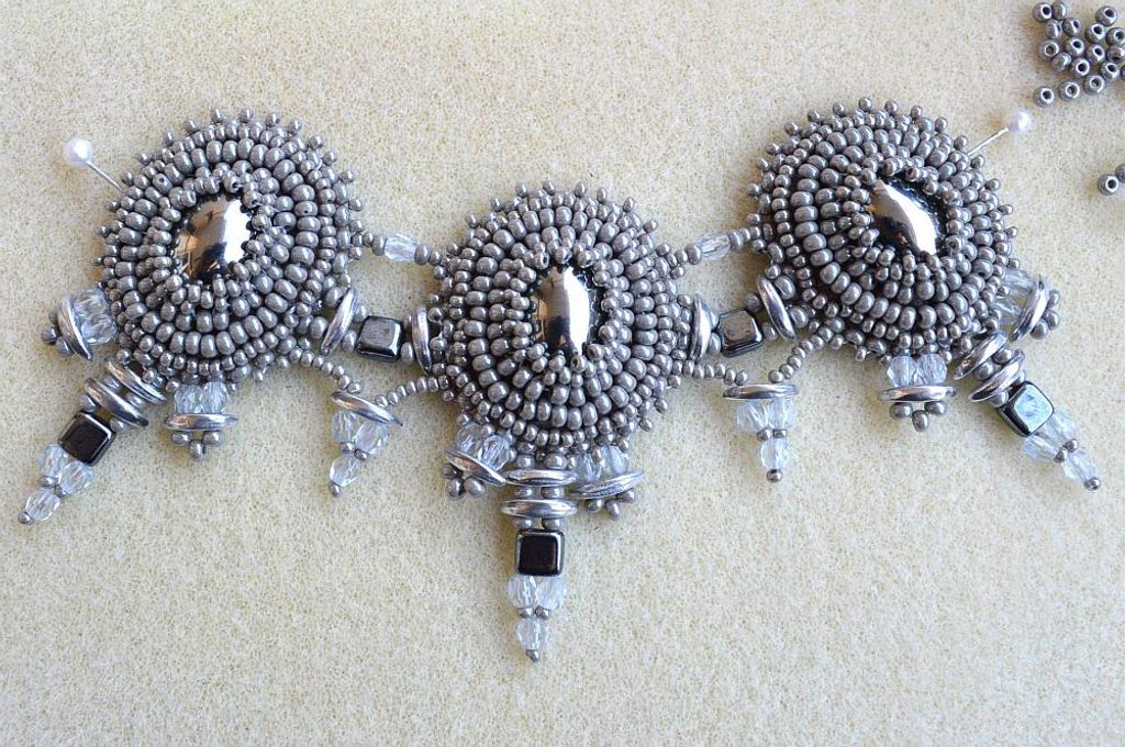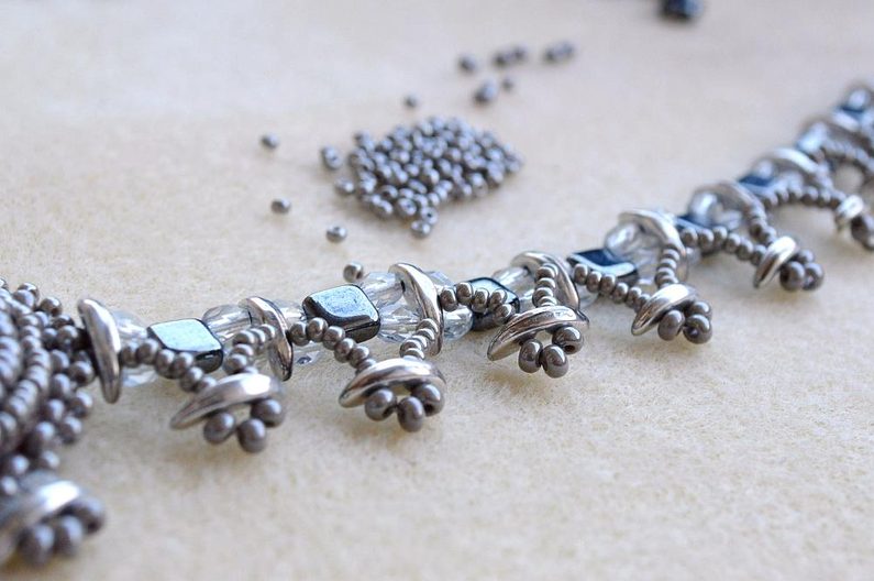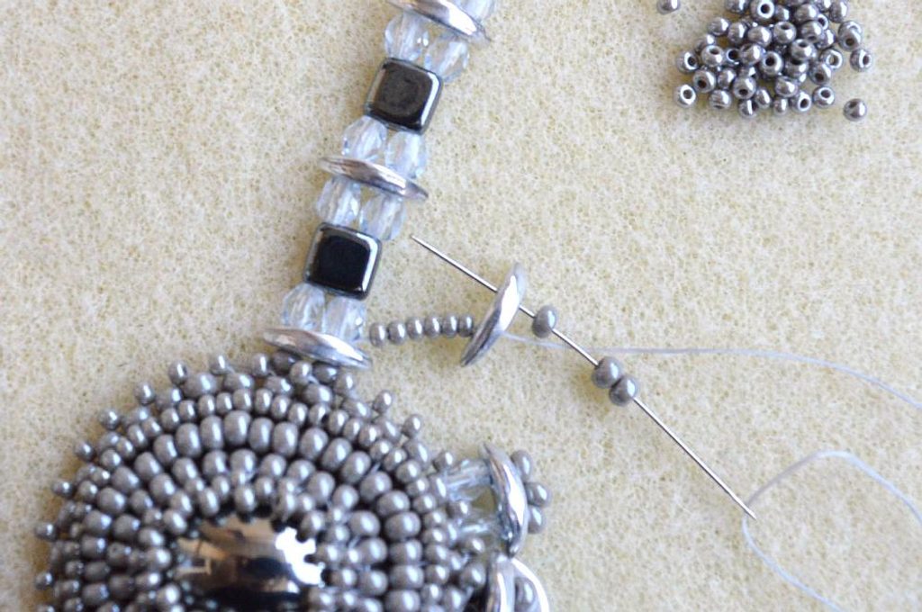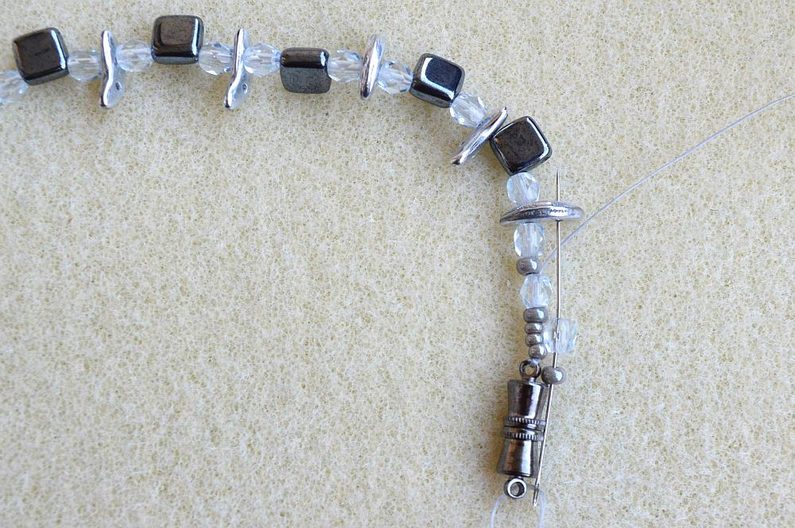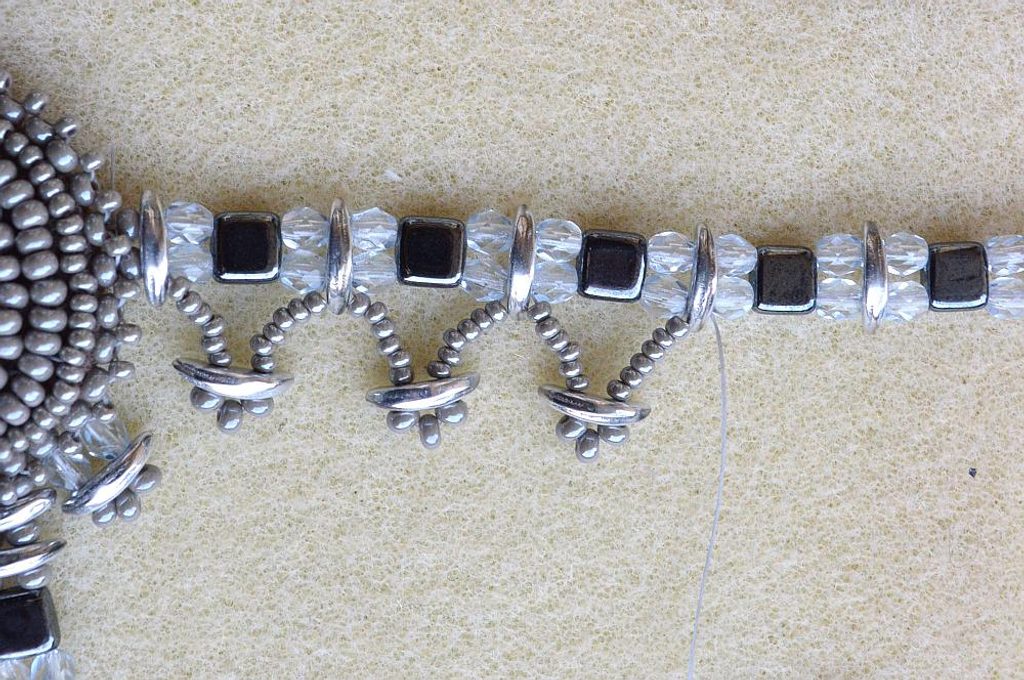 Vypíchneme ve spodní části CMC – navlékneme 6 PR10, 1 CMC, 3 PR8, které nazpět provlečeme druhou dírkou CMC. Opět navlékneme 6 PR10 a protáhneme spodním otvorem v CMC ve spodní řadě řetízku. Postup opakujeme až k poslednímu CMC v řetízku. Dostaneme se k původní linii před zapínáním, kterou provlékneme nit a zapošijeme očkem v zapínání. Protáhneme ji nazpět a zastřihneme mezi korálky tak, aby nebyla vidět.