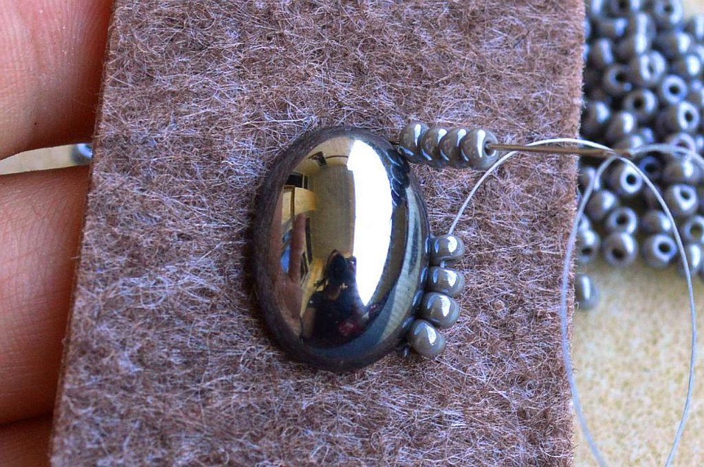 Začneme obšívat peyotovým stehem. První řadu vyšíváme k podkladu pomocí PR8. Navlékáme po 2 nebo po 4 korálcích, urovnáme si navlečenou řadu, vpíchneme do podkladu, utáhneme a vypíchneme jehlu zhruba uprostřed, po směru vyšívání pak provlečeme korálky.