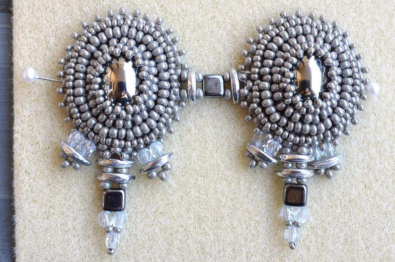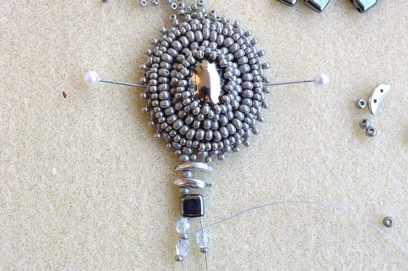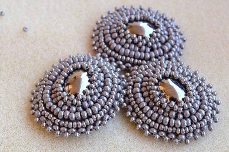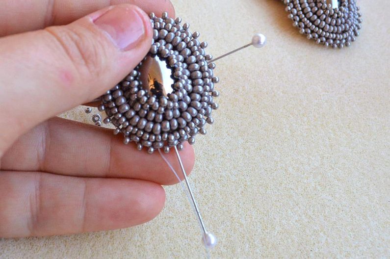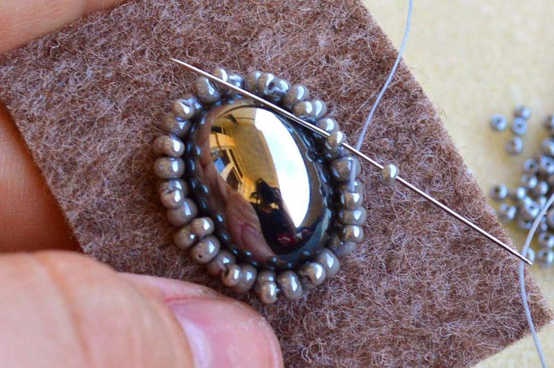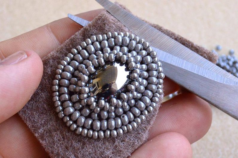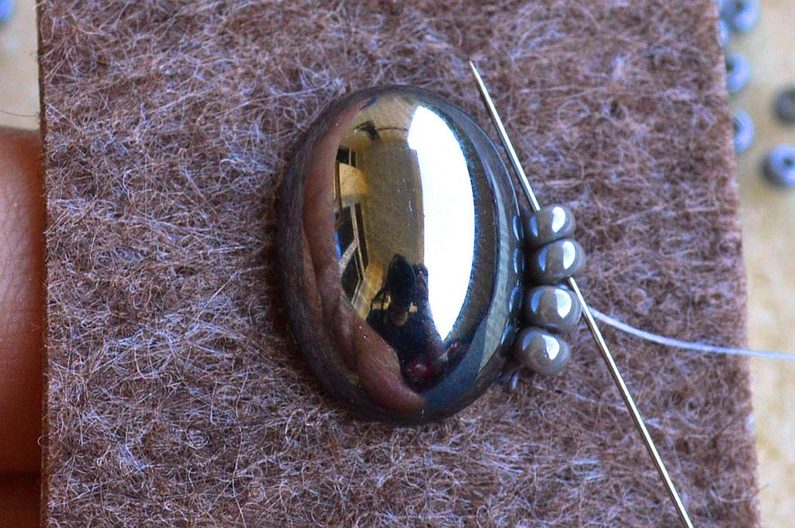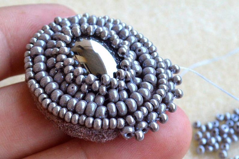 Kolem obšitého základu vyšijeme ještě dvě řady, první korálky PR8 a druhou korálky PR10. Při obšívání opakujeme postup z první řady kolem kabošonu.