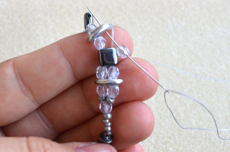 Nit zapošijeme hned vedle zapíchnutého špendlíku ve středové části. Navlékneme jednotlivé díly v pořadí PR8, CMC, PR8, CMT, PR8, CMC, PR8 (Obr. 36) a spojíme s druhým kabošonem.