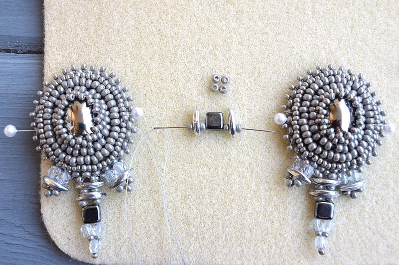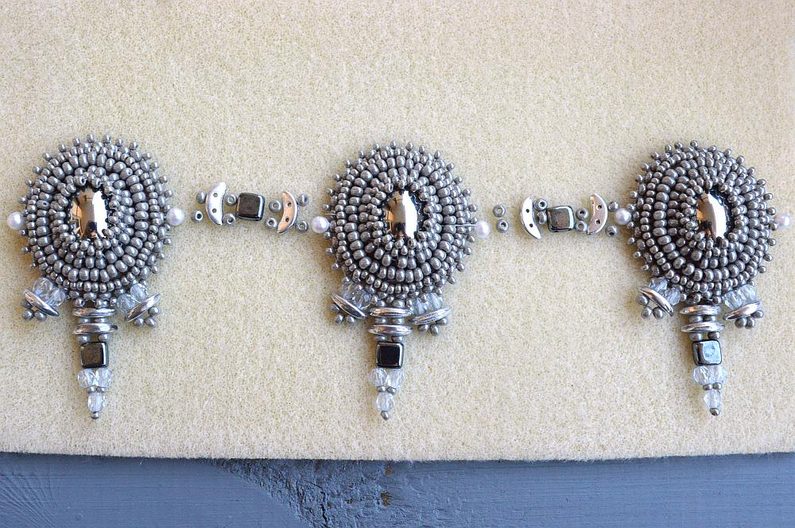 Obdobný postup opakujeme u bočních malých částí. Vypichujeme hned vedle zapošité části. Vždy vypichujeme korálkem, který tvoří obrubu vyšívané části. K vytvoření malého střapečku navlékneme 1 BK4, 1 CMC, 3 PR8 a 1 BK4. Všechny 3 šité střapečky šijeme vždy zvlášť.