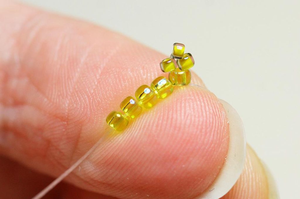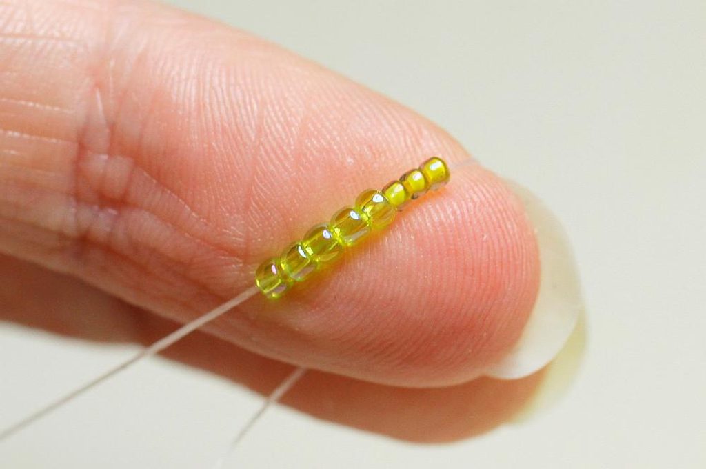 Na jehlu navlékneme 4x TR11 a protáhneme ji ještě jednou prvním z těchto čtyř korálků v opačném směru. Utáhneme.