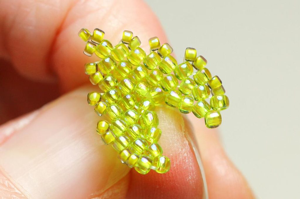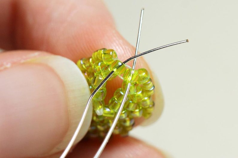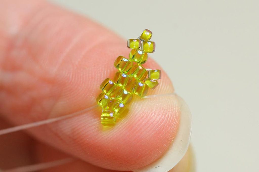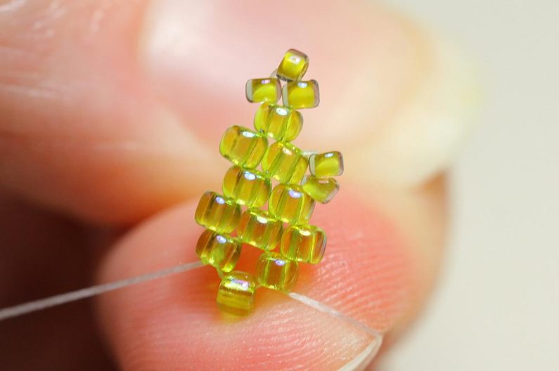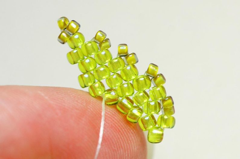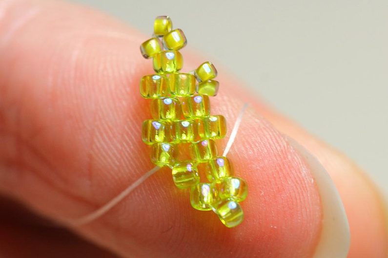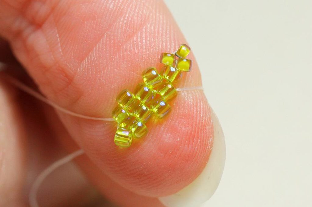 Navlékneme 2x TR15 a jehlu vedeme posledním TR11 z minulého kroku. Do mezírky všijeme 1x TR11.