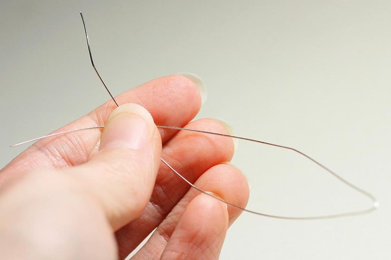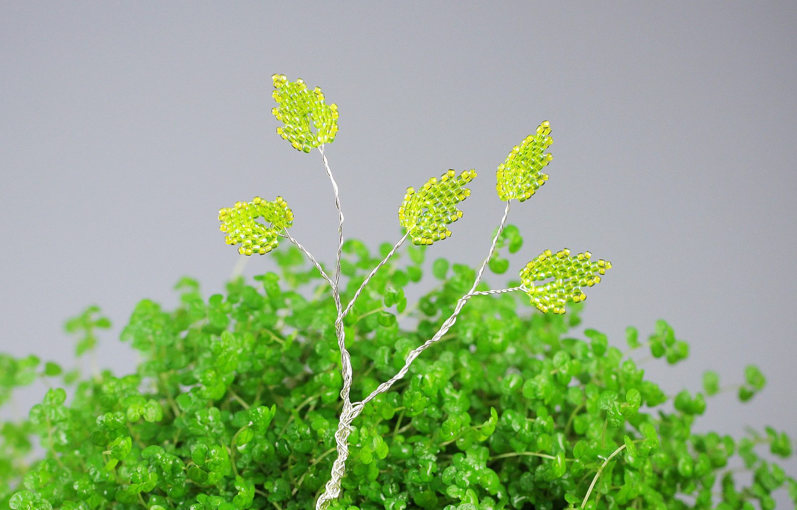 Uštípneme si cca 40 cm drátku. V půlce ho ohneme a oba konce provlékneme sešitými dvěma korálky lístečku, které jsme k sobě v posledním kroku sešili.