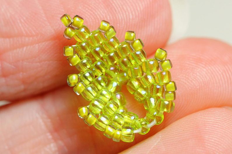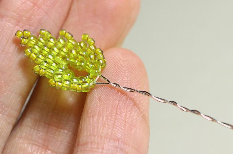 Jehlu vedeme zpět pěti korálky vnitřního lemu lístečku a prošijme poslední korálky u obou stran tak, aby se spojily. Jehlu opět protáhneme druhými pěti korálky vnitřního lemu lístečku, zauzlíkujeme, zapošijeme a ukončíme.