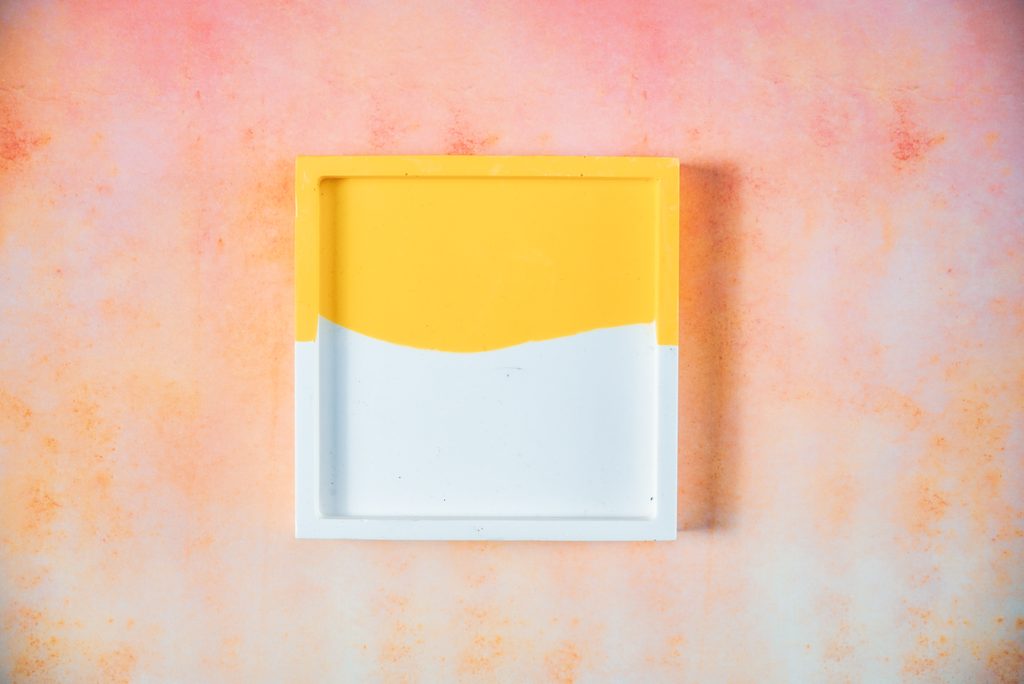Polovinu rozmíchané směsi obarvíme několika kapkami žlutého pigmentu a pečlivě rozmícháme. Žlutou hmotu nalijeme do formy z jedné strany a z druhé proti ní lijeme čistý neobarvený Jesmonite. Poté na silikonovou formu intenzivně klepeme, abychom dostali ven veškeré bublinky.