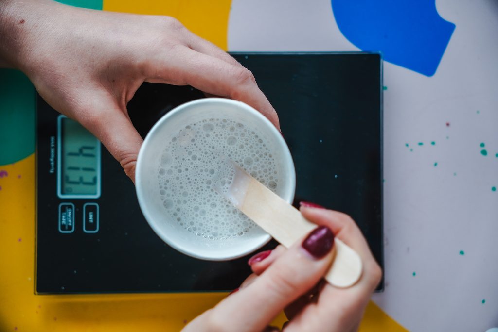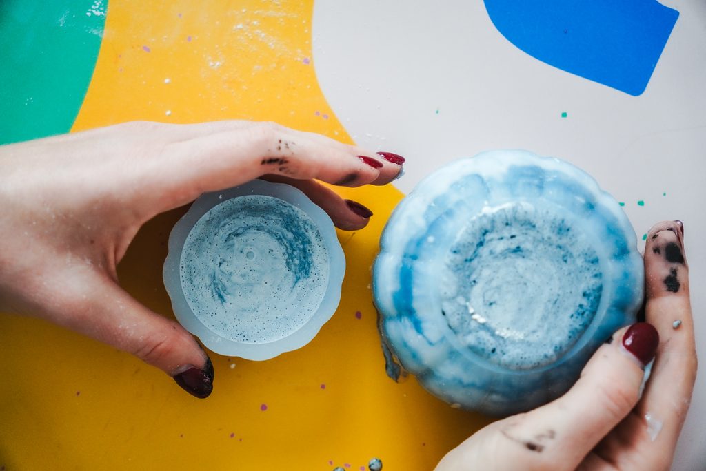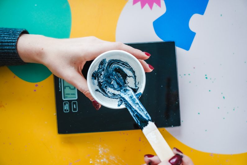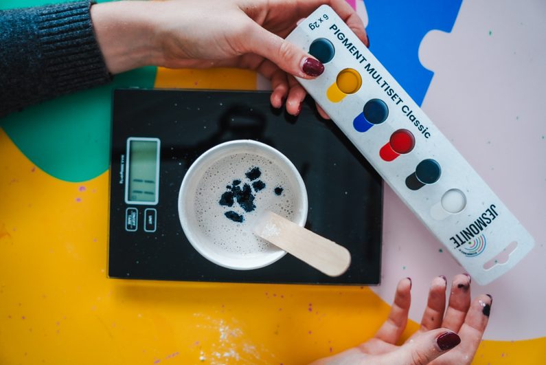 • Přimícháme barevný pigment. Stačí přidat kapku a pokud chceme dosáhnout mramorového efektu, jen lehce promícháme.