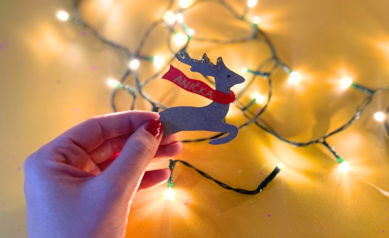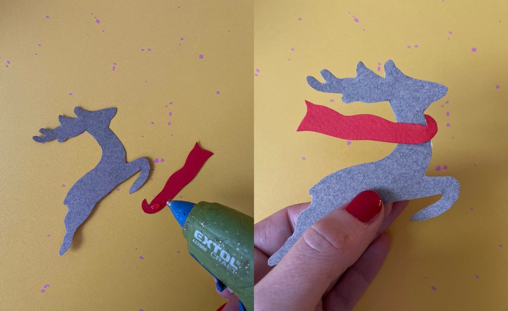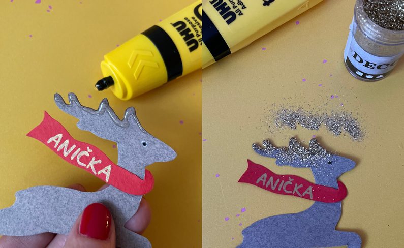 Po obvodu jelena aplikujete trošičku lepidla a posypete třpytkami.