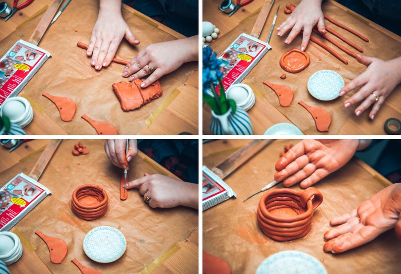 • Z hmoty si v ruce vyválíme hady o tloušťce cca 0,5 cm - délka a množství dle požadované výsledné velikosti kalíšku.