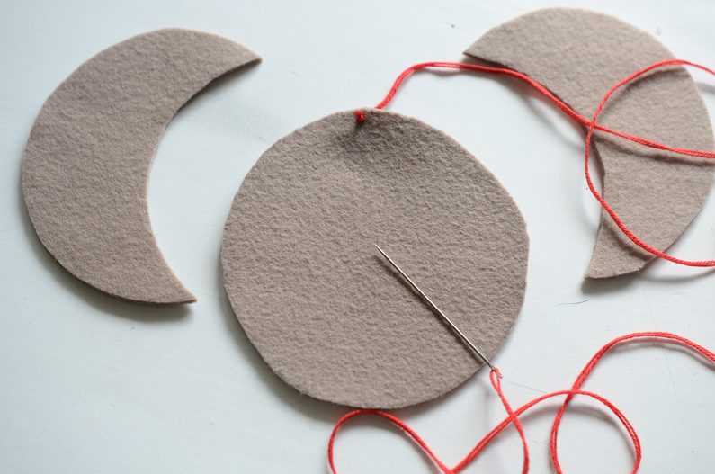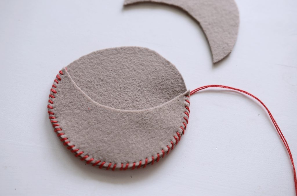 • Přiložte na kruh první půlměsíc a začněte jej přišívat – jehlu veďte vždy shora. Můžete použít jakýkoliv okrasný steh, například smyčkový.