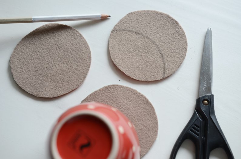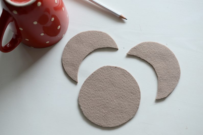 • Obkreslete 3x obvod hrnku na plstěnou látku. Jeden díl potřebujete celý. Dva díly vystřihněte ve tvaru půlměsíce.